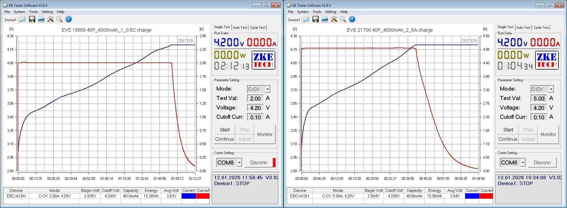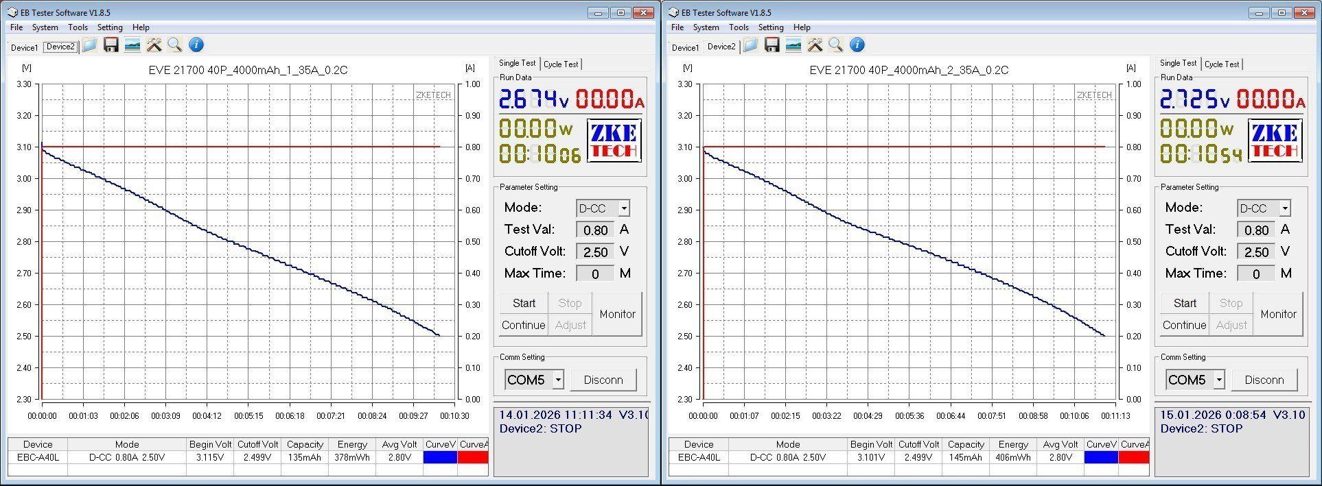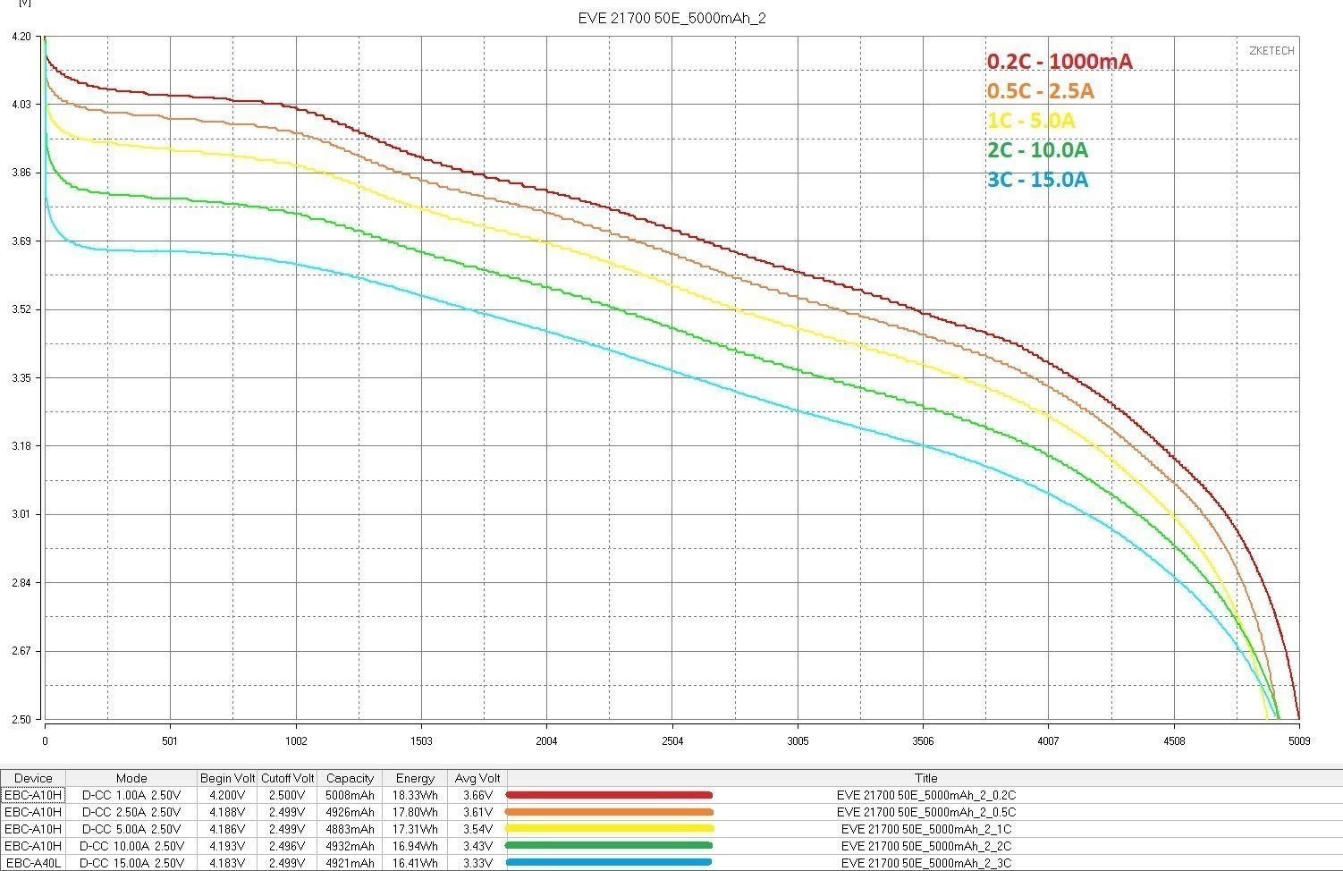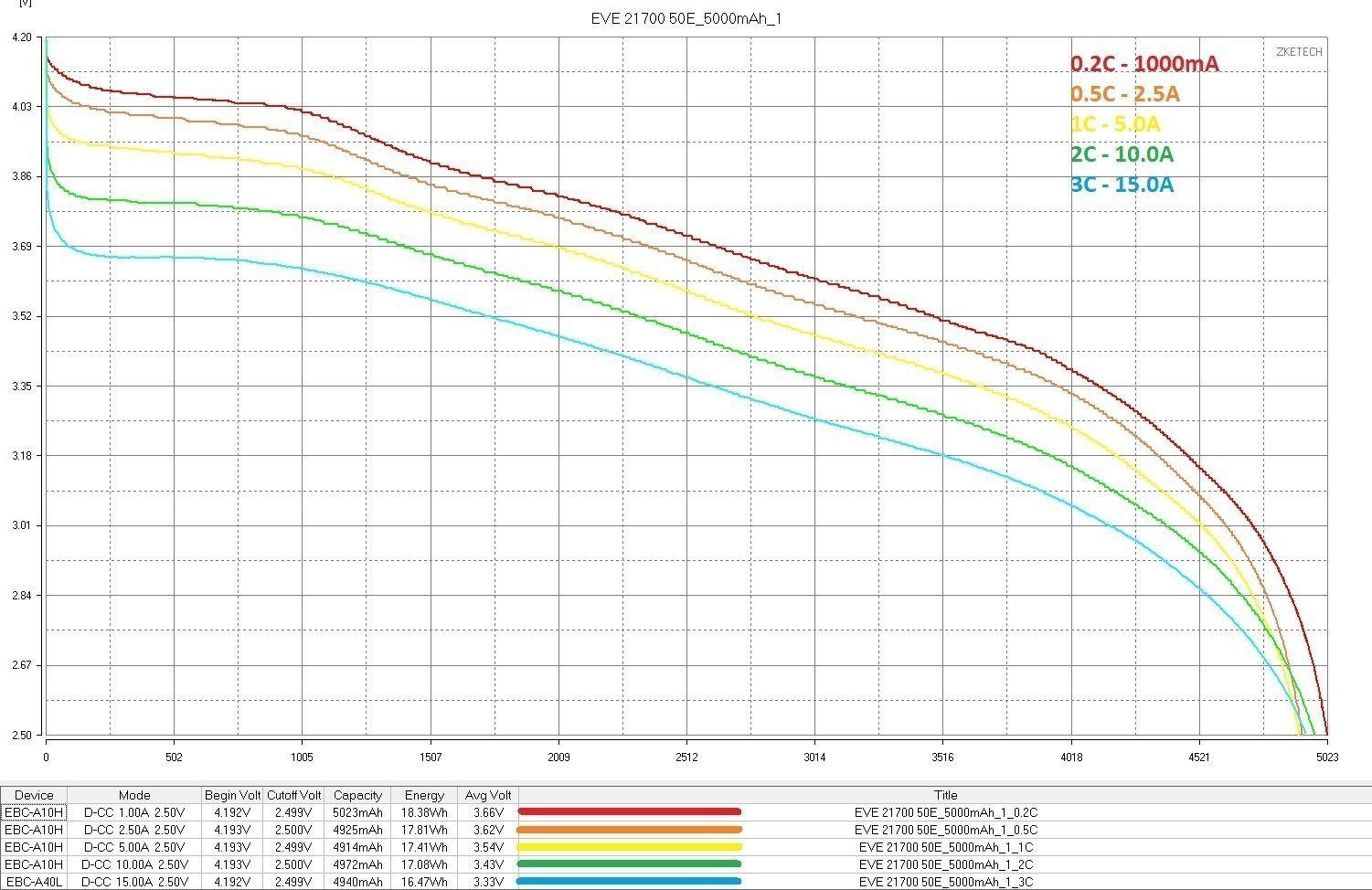 EVE 21700 50E_5000mAh - а вот эти ребята понравились куда больше, по результатам тестов они вполне на уровне известных фирменных ячеек сопоставимой емкости, да, это не топ на максимальные 5600-5800мАч, но и цена вполне доступная, в общем рекомендую, особенно для всяких повербанков, хотя думаю что и двухрядную батарею электроинструмента вытянут.