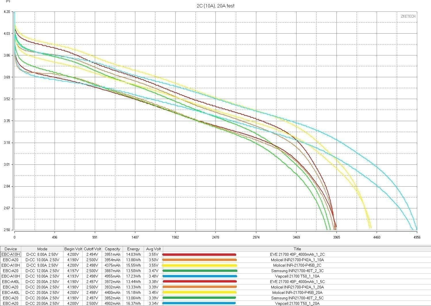 Так как присутствуют аккумуляторы с заведомо большей емкостью, то корректнее сравнить именно с моделями на 4Ач и здесь обозреваемые показали себя очень даже хорошо, причем что при 2С, что при 20А, сравнение при больших токах я сделать не могу из-за отсутствия таких данных по ннекоторым ранее протестированным моделям.