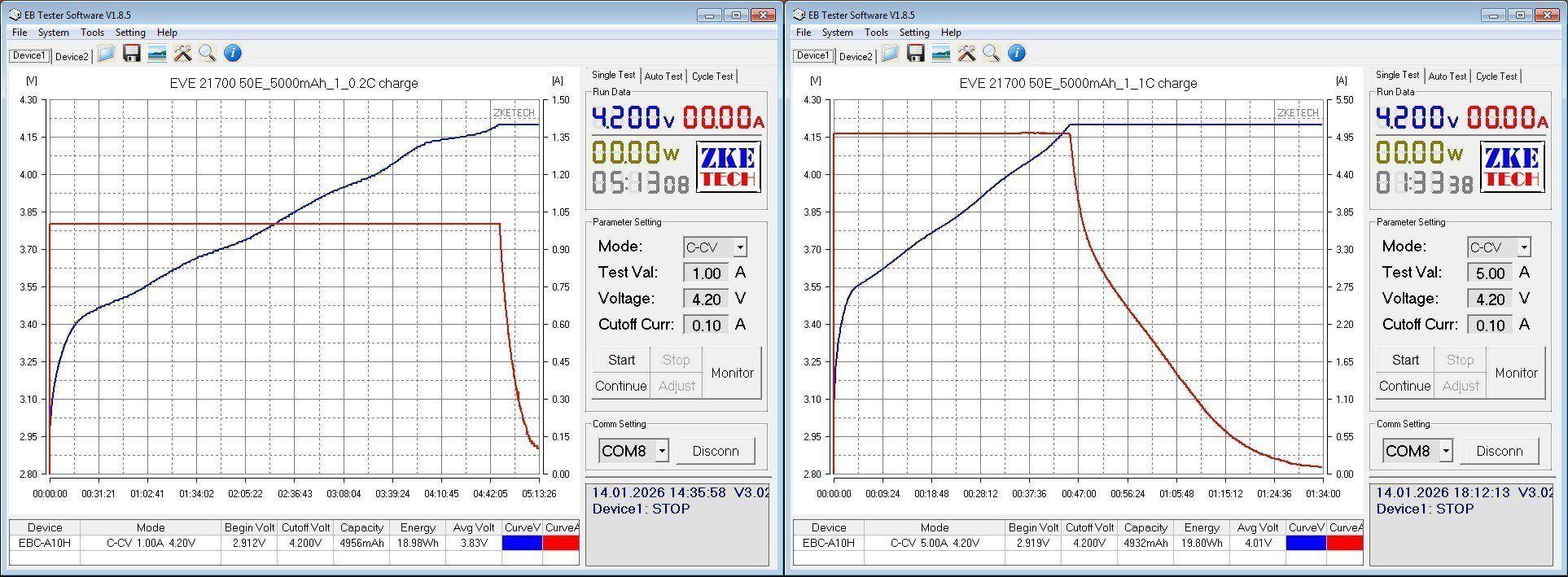 Да, я протестировал заряд в указанных режимах, при токе 0.2С заряд длился 5 часов 13 минут, а при токе 1С 1 час 33 минуты, но поведение при токе 1С на мой взгляд чуть получше чем у 18650 3.5Ач.