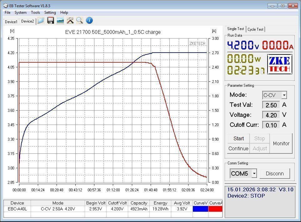 При токе заряда 0.5С на заряд ушло 2 часа 12 минут, для высокотоковых ячеек вполне нормальный результат, ускоренный заряд проверял при токе 5 ампер, потому как это максимальный ток для тестера EBC A10H, но так как он близок к максимальному 6 ампер, то не стал использовать здесь более мощную нагрузку.