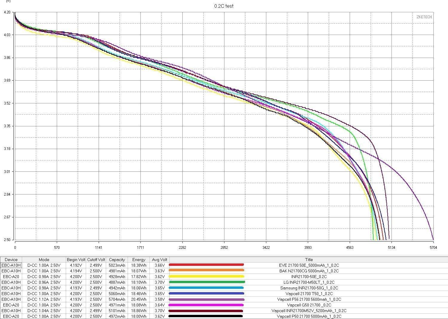 При токе 0.2С EVE всего немного отстает от моделей на 5200мАч и явно обгоняет другие варианты на 5000Ач.