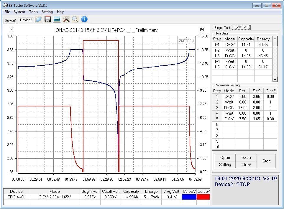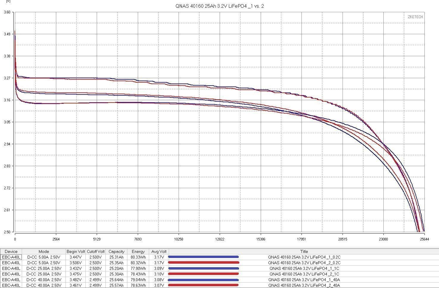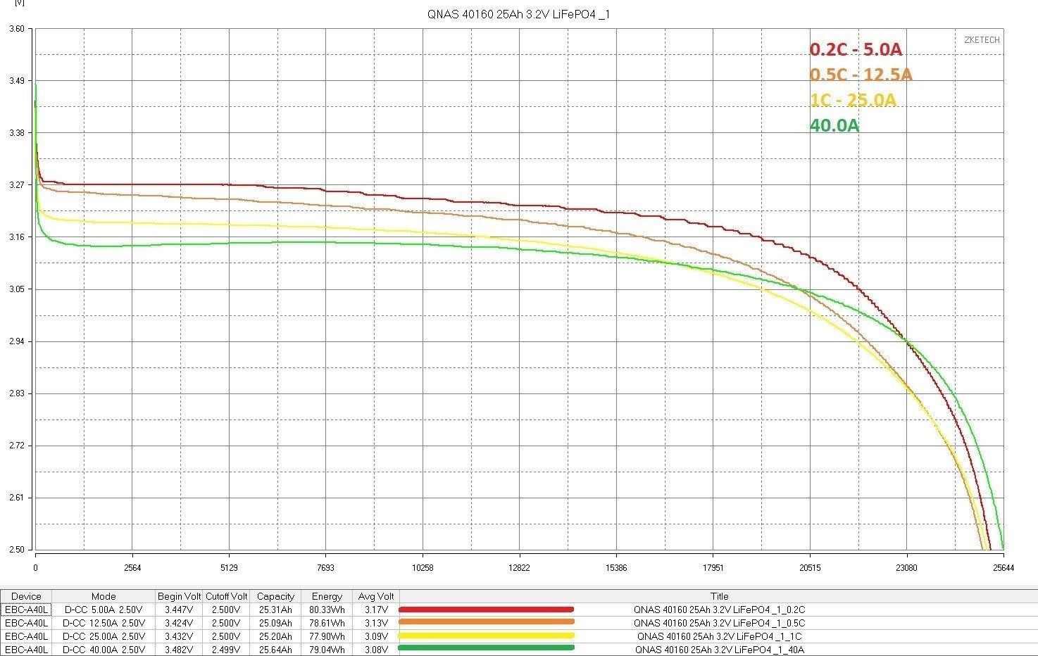 QNAS 32140 15Ah - не менее интересный вариант, хотя и "читерский", любопытно что они оказались лучше при токах 0.2С и 40А (даже без учета "читерства"), но проиграли предыдущим при 1С, впрочем на мой взгляд они все равно неплохие, потому как уверенно попали в тройку с EVE IFR33140 и JSK 32140 15Ah