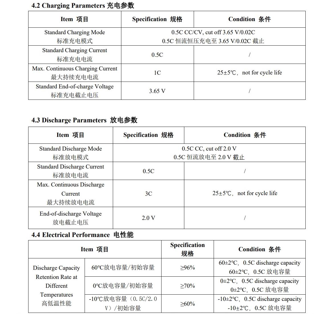Заявлена номинальная емкость 15Ач и минимальная 14Ач при разряде до 2.5 вольта, максимальный ток разряда 3С, заряд током 0.5С номинальный и ускоренный при комнатной температуре, 2С.