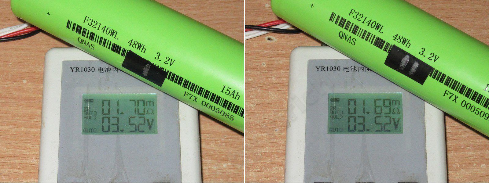 Ну и импеданс после всех тестов и полного заряда, примерно раза в полтора ниже чем у предыдущих ячеек формата 32140, по этому параметру они по сути пропорциональны емкости и полностью соответствуют даташитному значению.