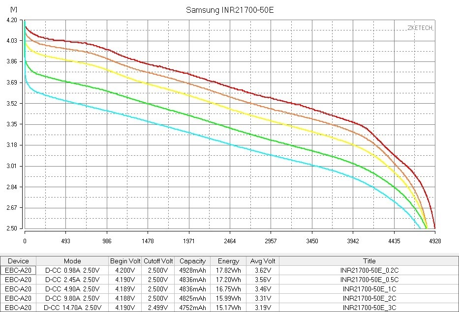 Технические данные из даташита и здесь мы опять видим то же самое, что было показано в обзоре Самсунг INR18650-35E, при маркировке 50, емкость аккумулятора не 5000мАч, что можно было бы ожидать, а 4900. Скорее всего производитель просто округляет значение, но опять почему-то в большую сторону.