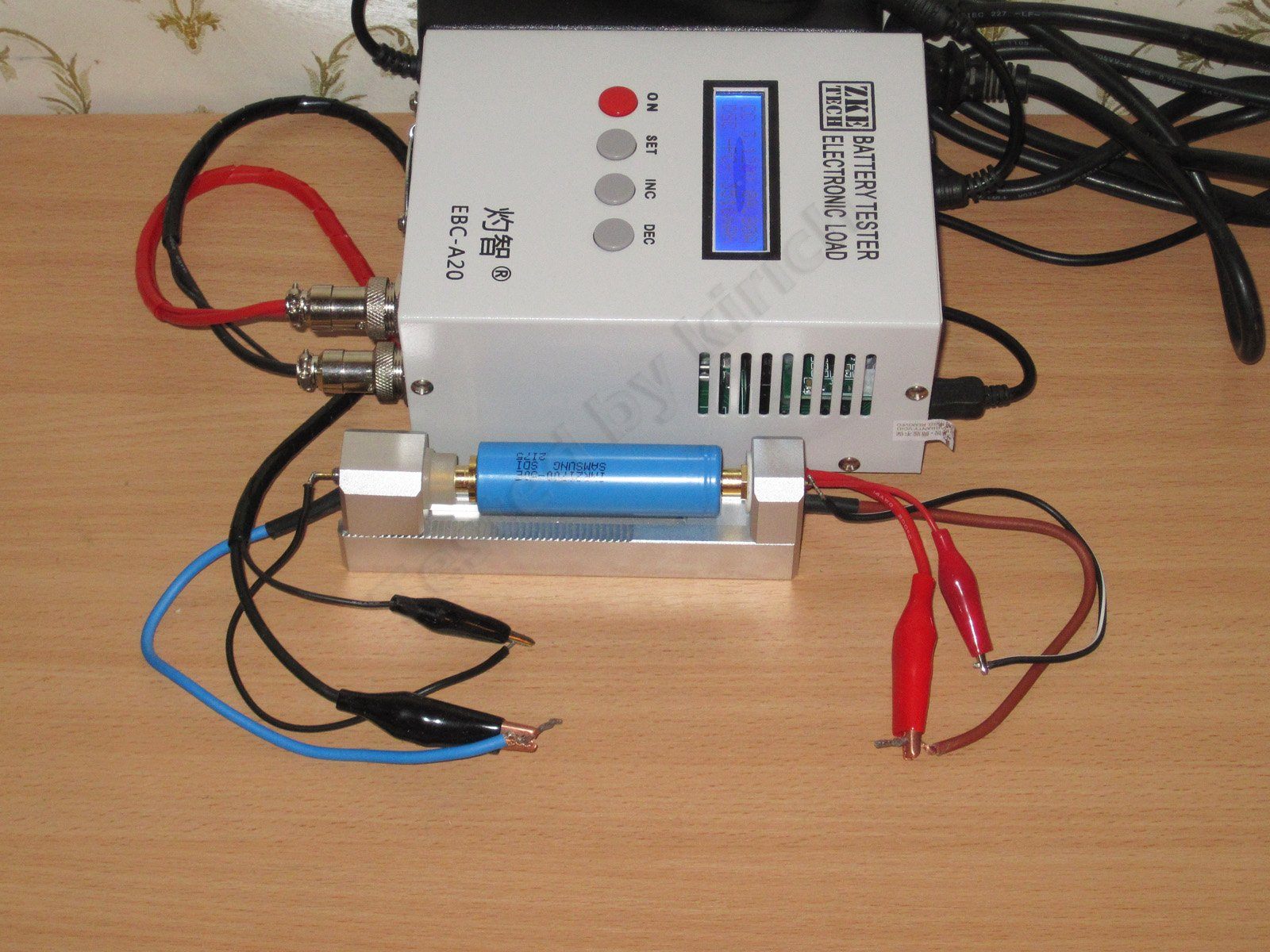 И хотя характеристики заявлены для тока в 9,8А, я взял более высокотоковую электронную нагрузку EBC-A20, которая может нагружать токами до 20 Ампер. Сделано это было из-за того, что помимо тока в 9,8А, заявленного как максимальный длительный, в даташите был указан и ток 14.7 Ампера, который является максимальным, но не циклическим, т.е. разряжать таким током аккумулятор можно, но лишь эпизодически.