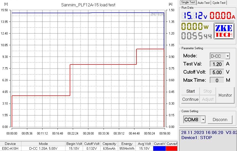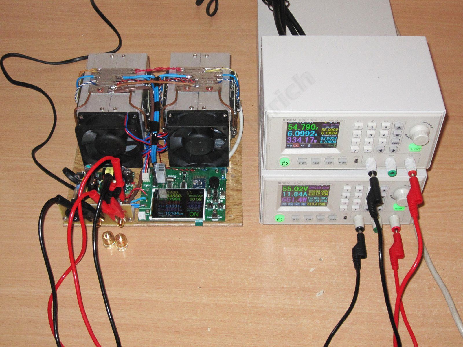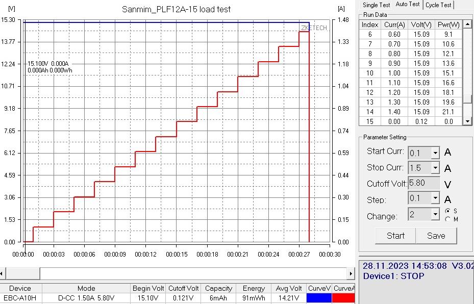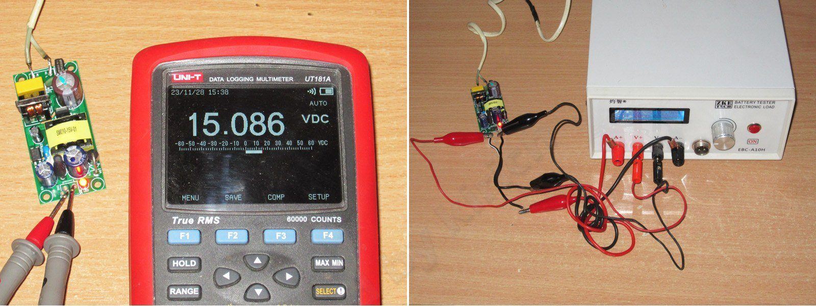 Без нагрузки на выходе почти 15.1 вольта, регулировки выходного напряжения нет. Дальше тесты проходили при помощи нагрузки с четырехпроводным подключением, подключено было так, что напряжение измерялось непосредственно на выходе платы.