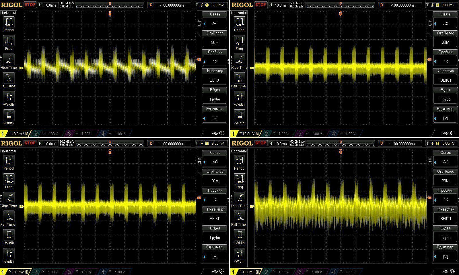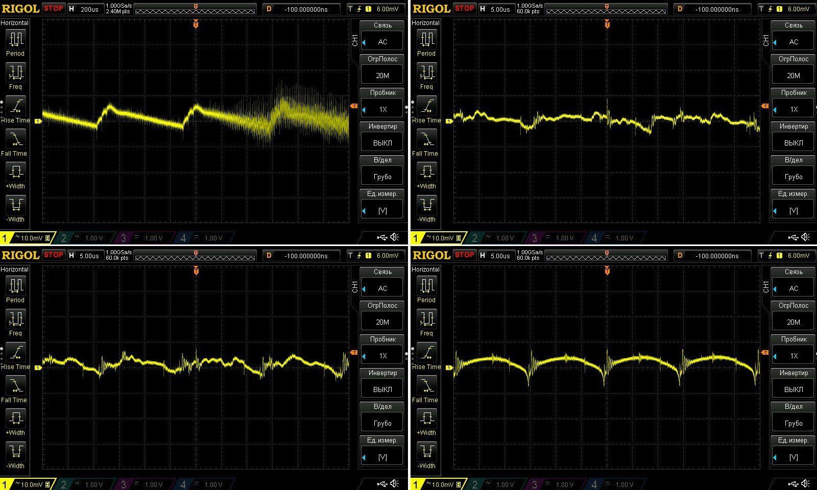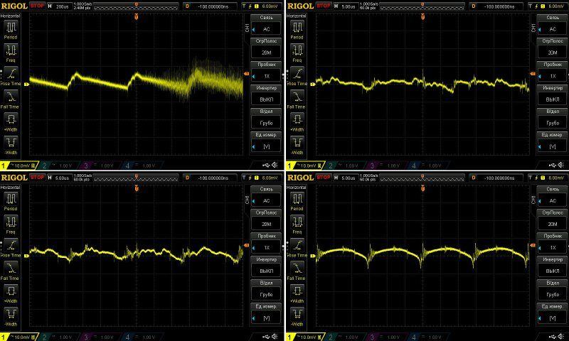 И конечно тест на размах пульсаций по выходу. Заявлено не более 100мВ для всех моделей блоков питания.