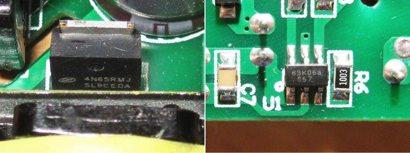 Высоковольтный транзистор 4N65RMJ, управляет им ШИМ контроллер 63K06A