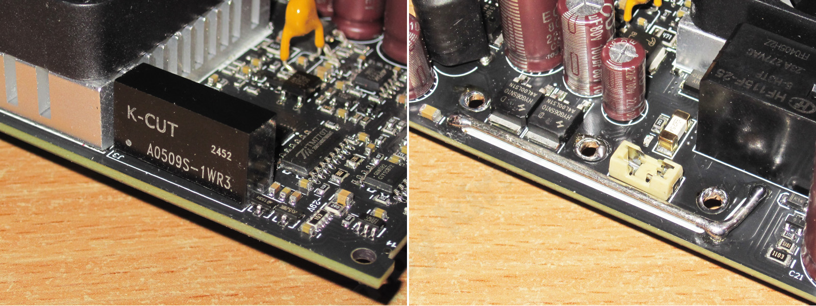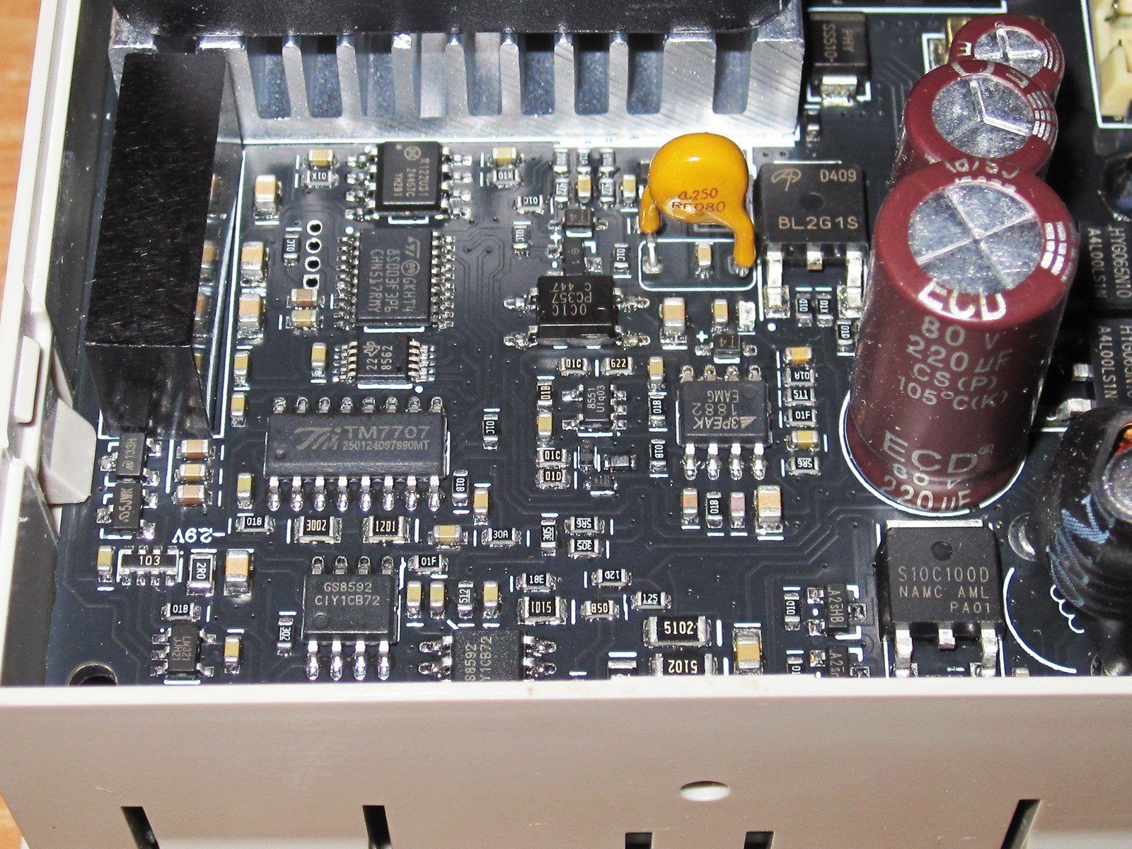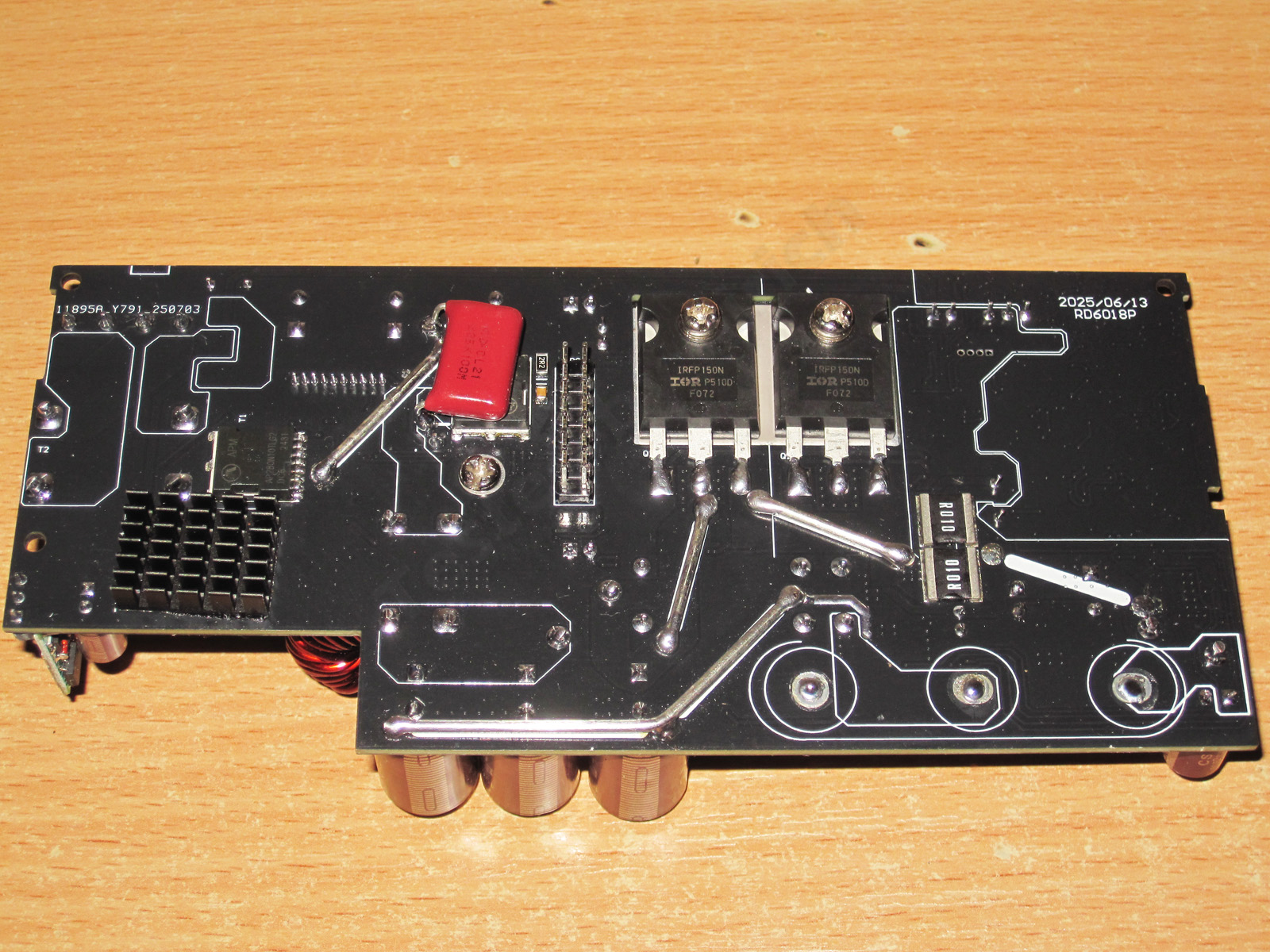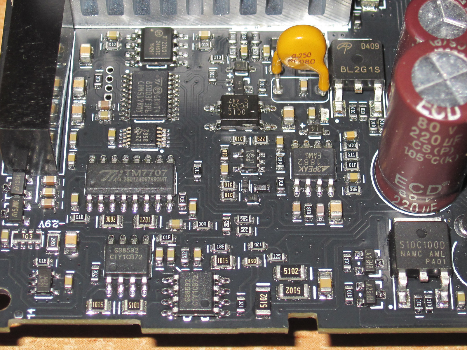 А вот силовая плата мне конечно была куда как интереснее. сразу отмечу то, что очень много силовых дорожек продублировано проволокой большого сечения.