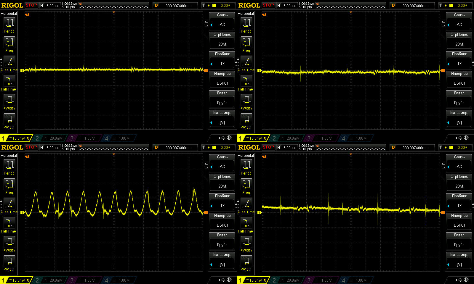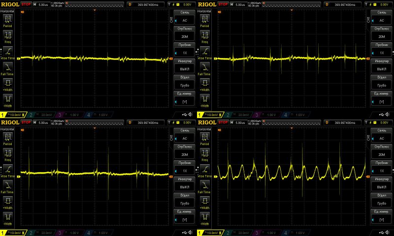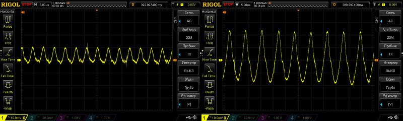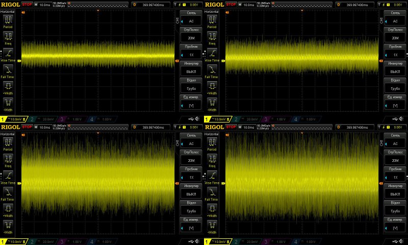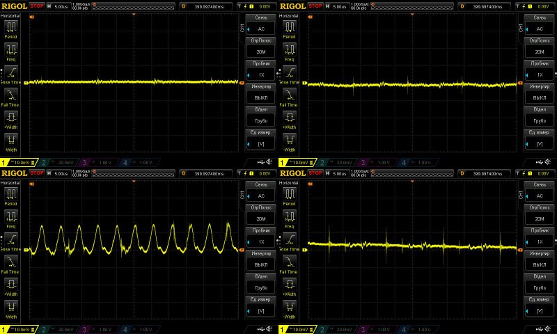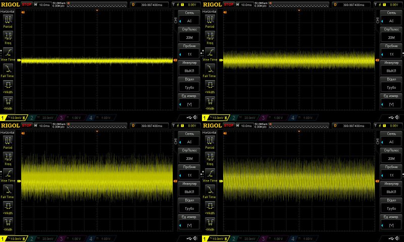 Этот тест я раньше не проводил, здесь я решил посмотреть НЧ пульсации. И хотя на мой взгляд здесь заметно гадит RD6030, а точнее его блок питания, но все равно можно оценить что вообще творится.