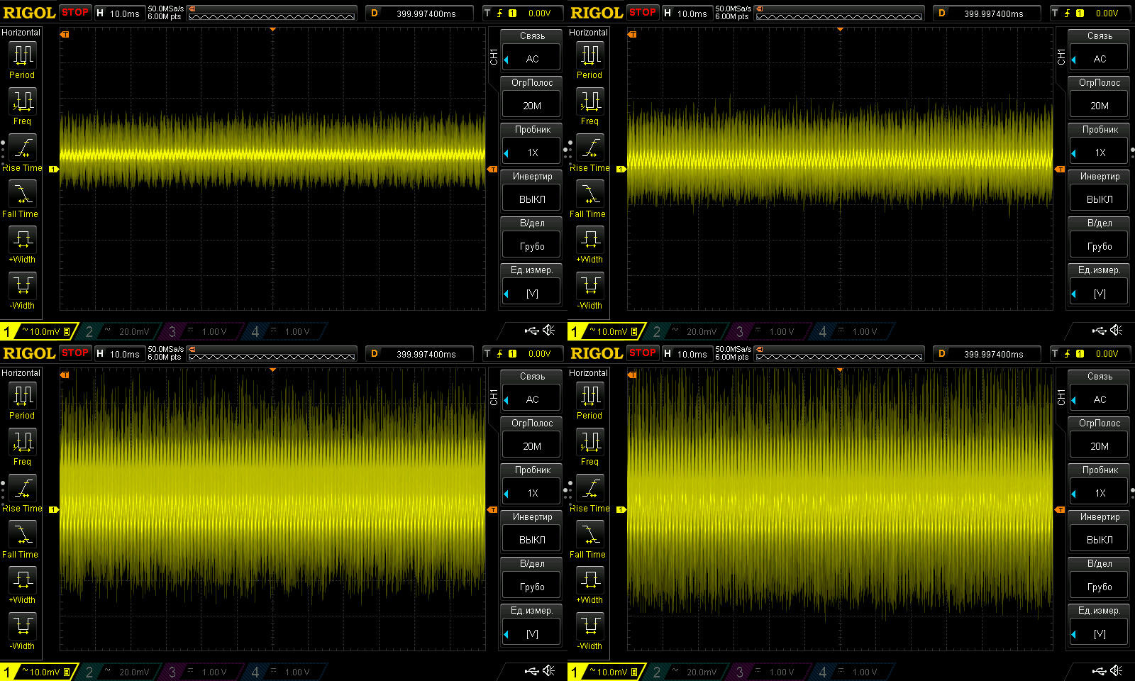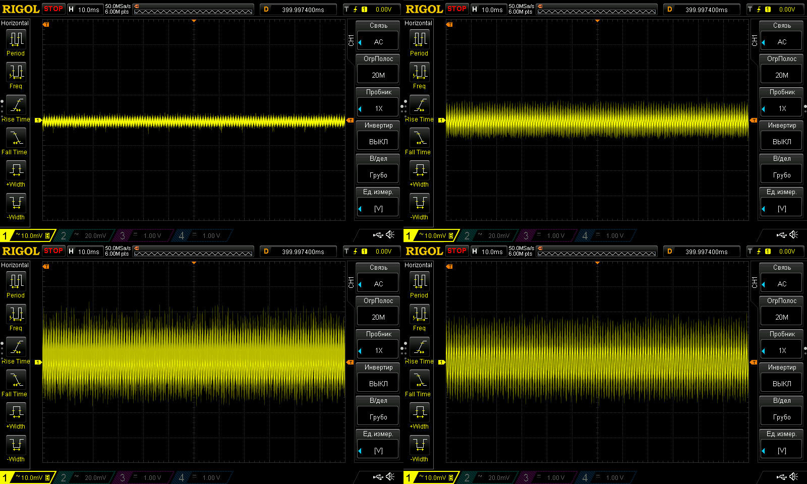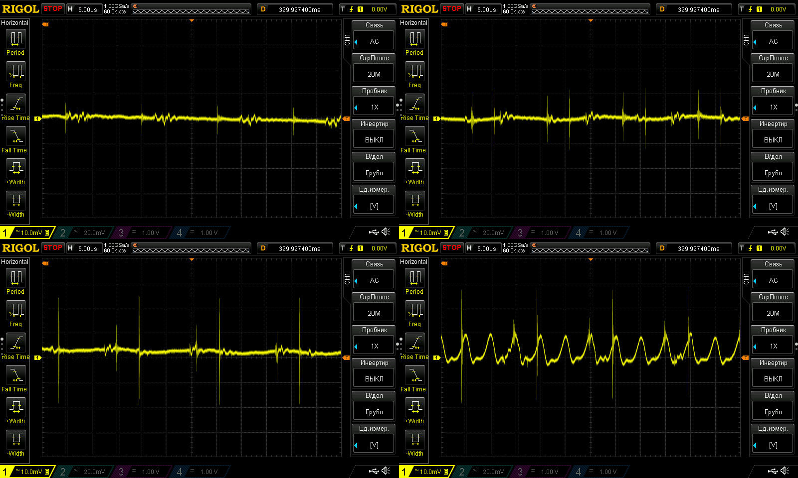 Этот тест я раньше не проводил, здесь я решил посмотреть НЧ пульсации. И хотя на мой взгляд здесь заметно гадит RD6030, а точнее его блок питания, но все равно можно оценить что вообще творится.