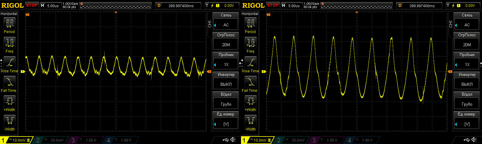 Была поначалу какая-то странность, я выставил ток нагрузки 6А, сделал скрин, потом 12А, сделал скрин, удивился, потом поднял до 17.5А и удивился еще больше, потому как пульсаций почти не было, в отличие от теста при токе 6А (слева) и особенно 12А (справа).