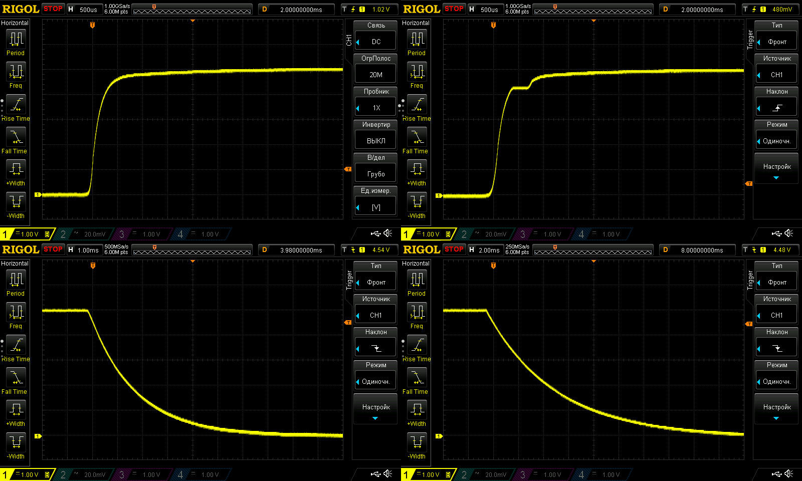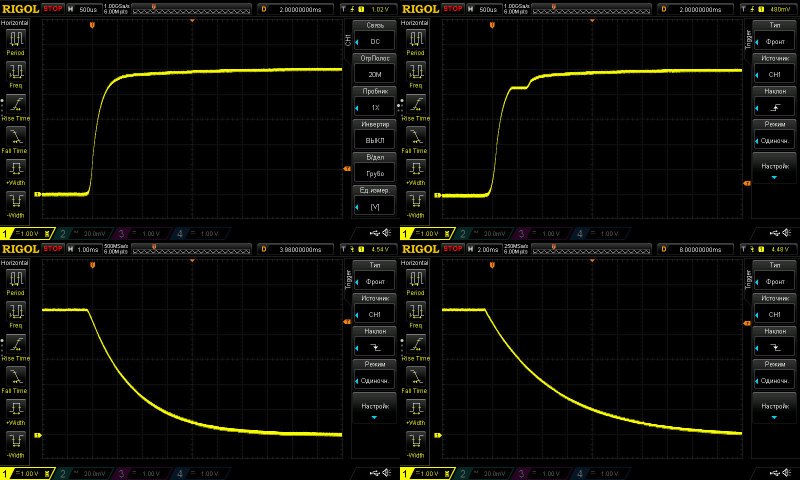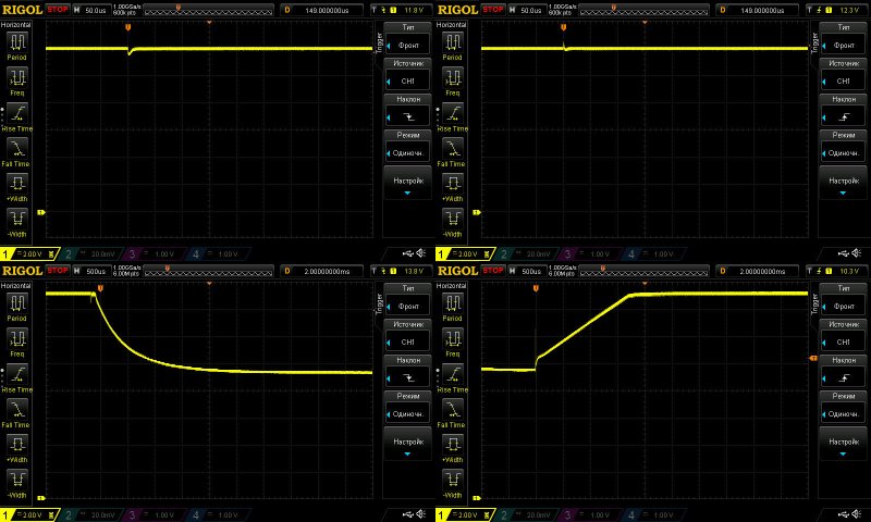 3, 4. Снятие напряжения с выхода, здесь ступеньки не появлялись, но вот если присмотреться, то можно заметить, что на втором скрине выключение занимает примерно в два раза больше времени, что подтверждает две вещи - конденсаторы подключаются параллельно выходу, делают это они в зависимости от установленного тока, а не от выходного. Т.е. если вы накрутили 3 ампера, то емкость будет по минимуму, если выставили 18А, то по максимуму.