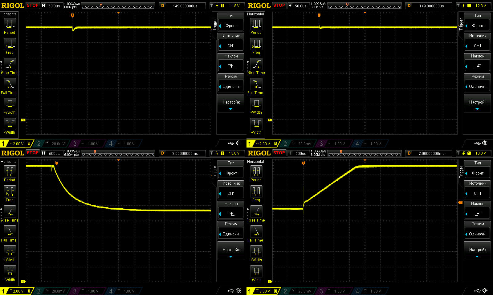 1, 2. подключение и отключение дополнительной нагрузки. На выходе БП 12 вольт, постоянно подключен резистор 30 Ом, параллельно ему подключался резистор 3.3 Ома, соответственно здесь реакция на перепад тока 0.4-4А и 4-0.4А. в общем без претензий.