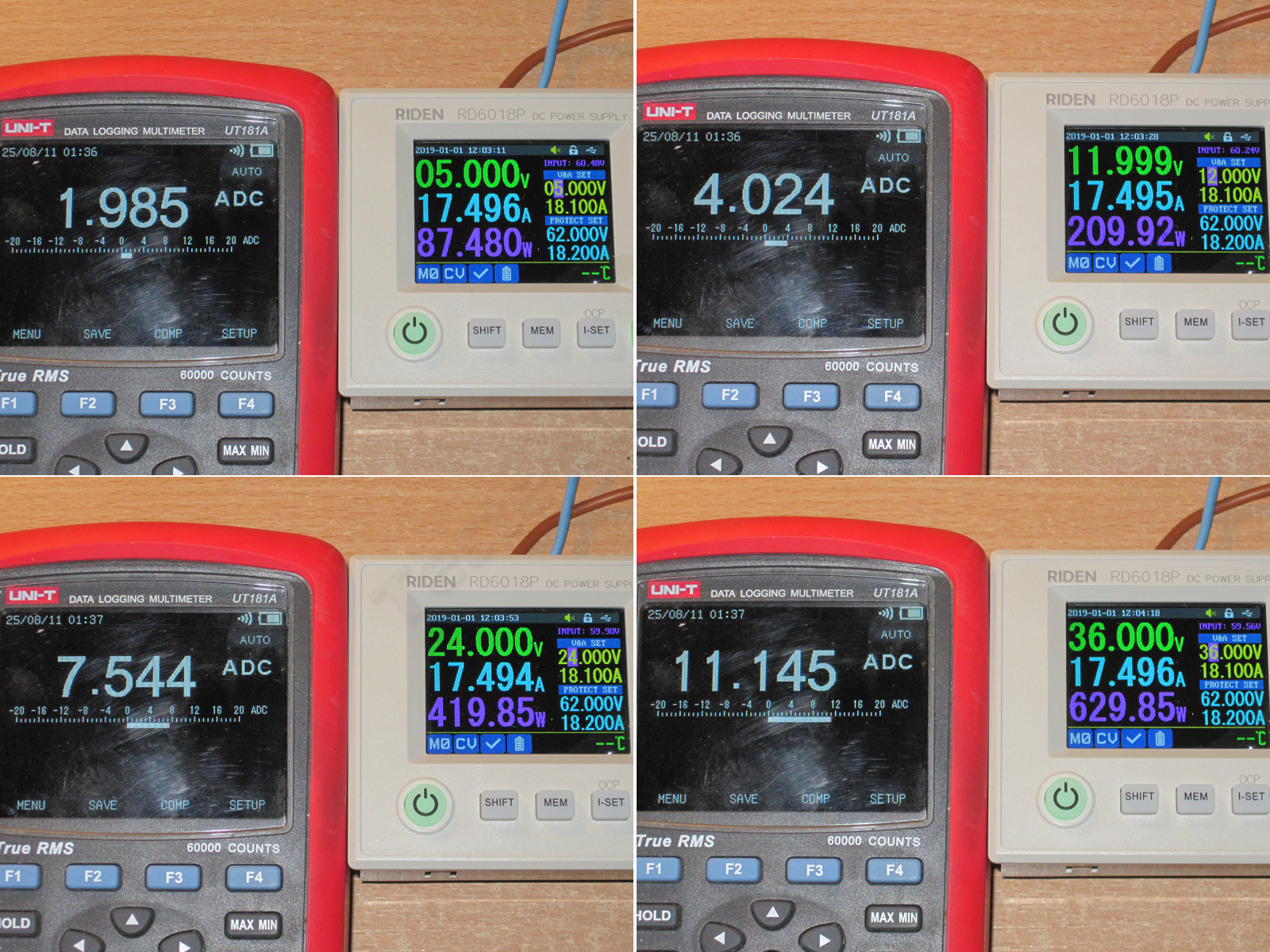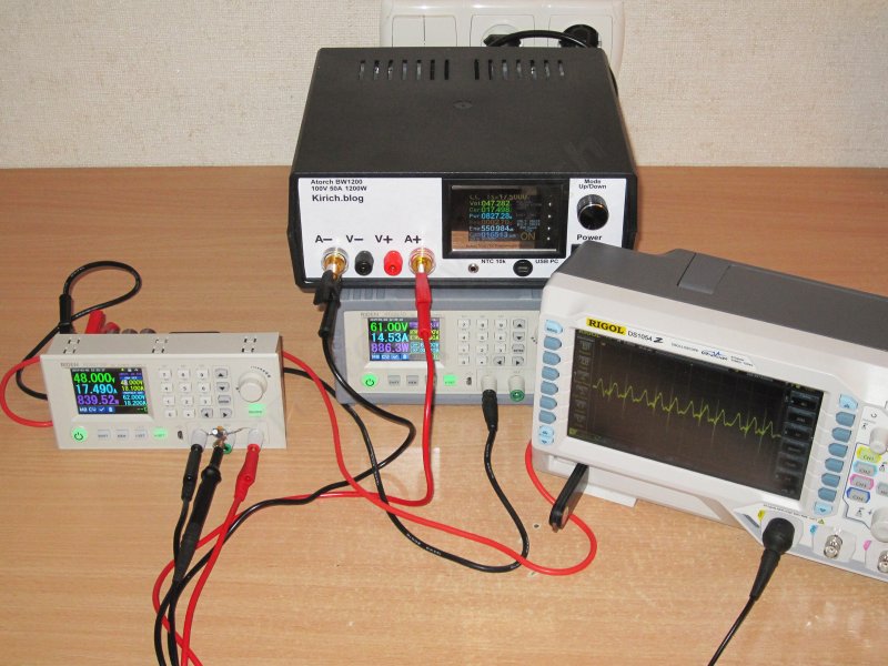 Проверял в четырех режимах, при 5 и 40 вольт выходного напряжения, а также при 1 и 17А тока нагрузки.