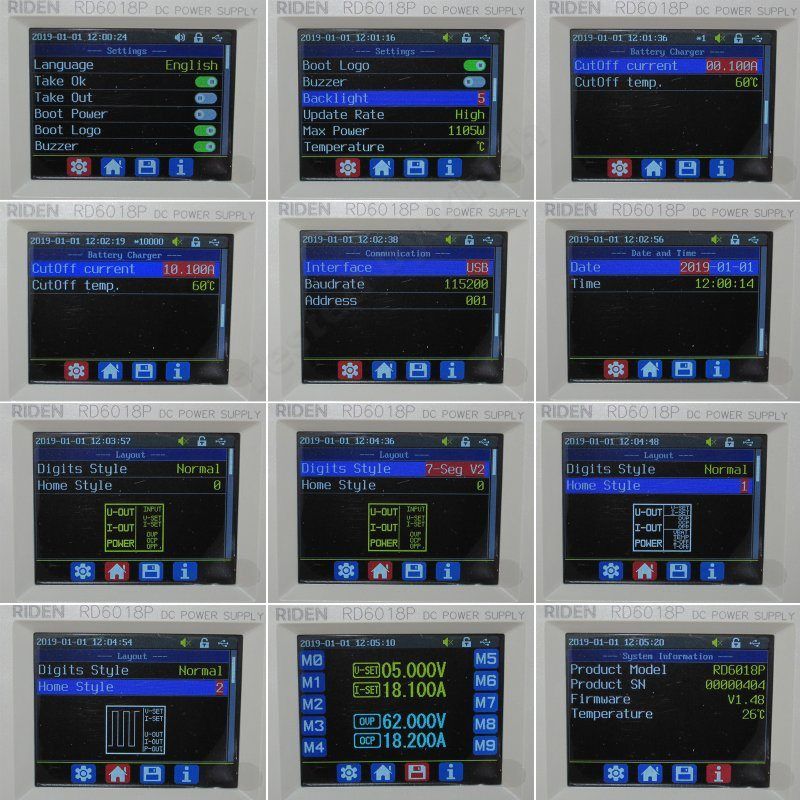 По сути здесь важны два экрана, главный, из которого идет управление и контроль всех функций. Кстати, у 6012Р внизу был выбор 6/12А, здесь такого выбора нет, что еще раз говорит отом, что преобразователь всегда работает в одном режиме.