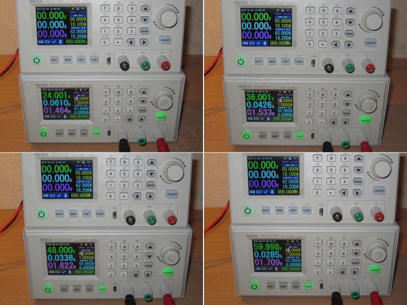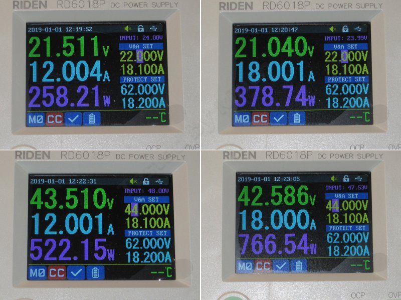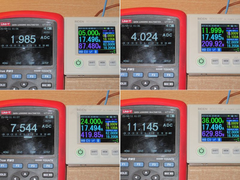 Проверял при входном около 60-61 вольта, ток 17.5А, напряжение на выходе 5, 12, 24 и 36 вольт.