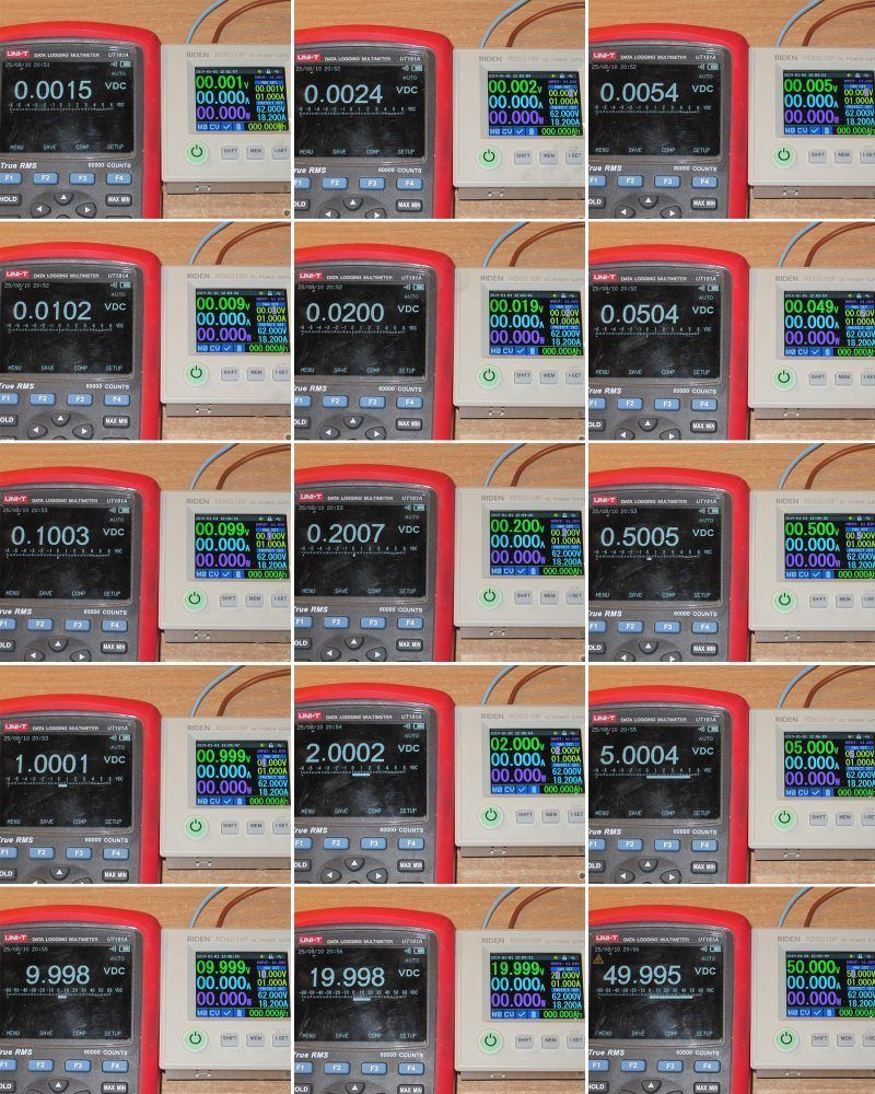 Тест второй, точность задания выходного напряжения без нагрузки, проверял в диапазоне от 1мВ до 50 вольт по сетке 1-2-5.
