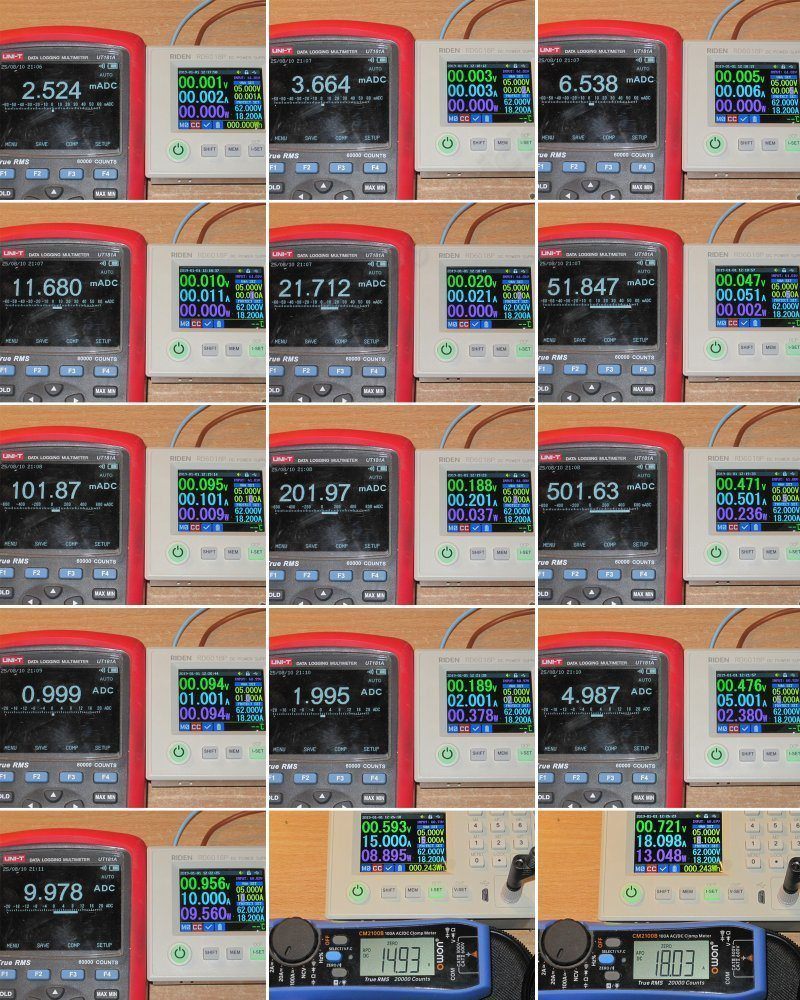 Ну тут картина немного похуже, виден заметный разбег в большую сторону до примерно 100мА, после тока в 1 ампер знак погрешности меняется на противоположный и ток начинает занижаться, хотя до 10А я не вижу в этом ничего критичного. К сожалению ток более 10А я могу измерить только клещами, потому там погрешность под вопросом.