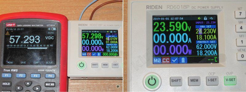При входном 24 вольта я получил 2.5 и 3 вольта, при входном 48 вольт было 4.5 и 5.5 вольта соответственно. Я думаю, что для получения полных 61 вольт блок питания должен иметь минимум на 6-7 вольт больше, т.е. 67-68 вольт, а лучше поближе к 69-70.