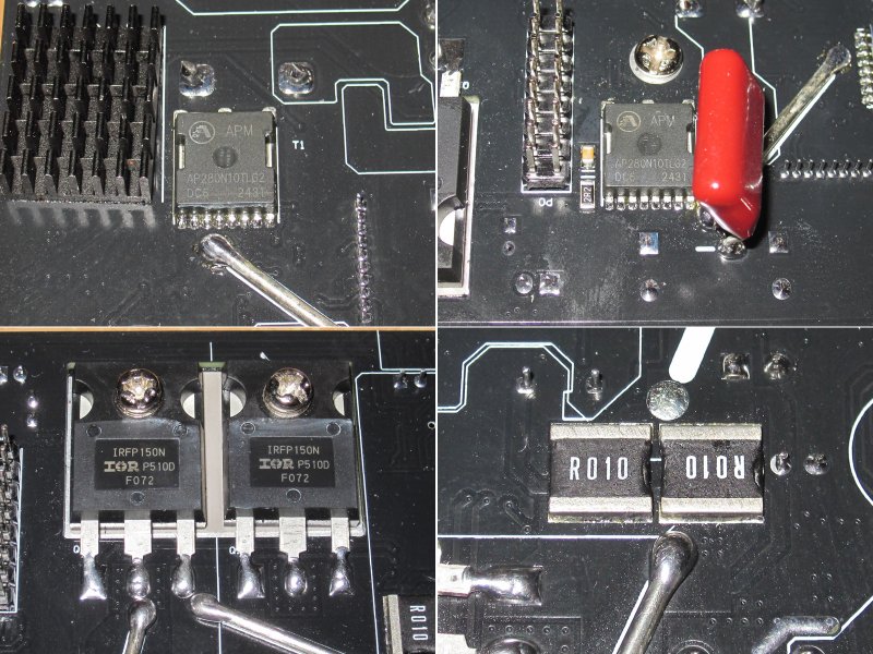3. Транзисторы линейного стабилизатора, любопытно что у 6012Р были биполярные, а здесь поставили полевые, силовые выводы соединены параллельно, а вот затворы между собой не звонятся. Любопытно сравнить минимальное падение, у IRFP150 сопротивление 36мОм, у TIP35 падение в горячем состоянии и при токе 10А составляет около 0.45 вольта, у IRFP150 при токе 9А (половина от 18, так как транзисторов два) падение будет 0.324 вольта, не такая и большая разница, как по мне.