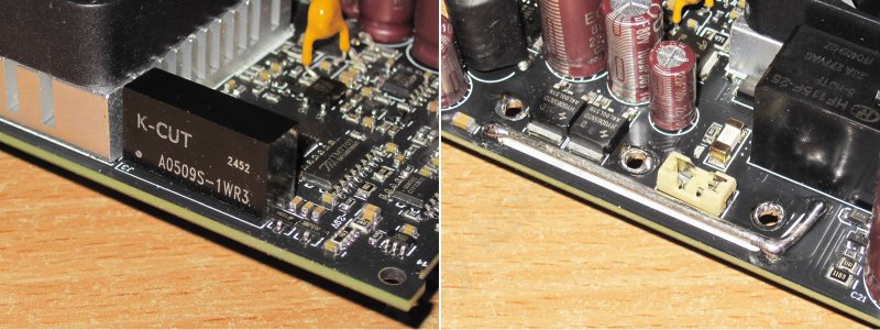На плате также имеется DCDC с гальванической развязкой, 5-9 вольт, кроме того, силовые дорожки местами усилены и с другой стороны платы, в частности на фото дорожка ведущая к плюсовой клемме.