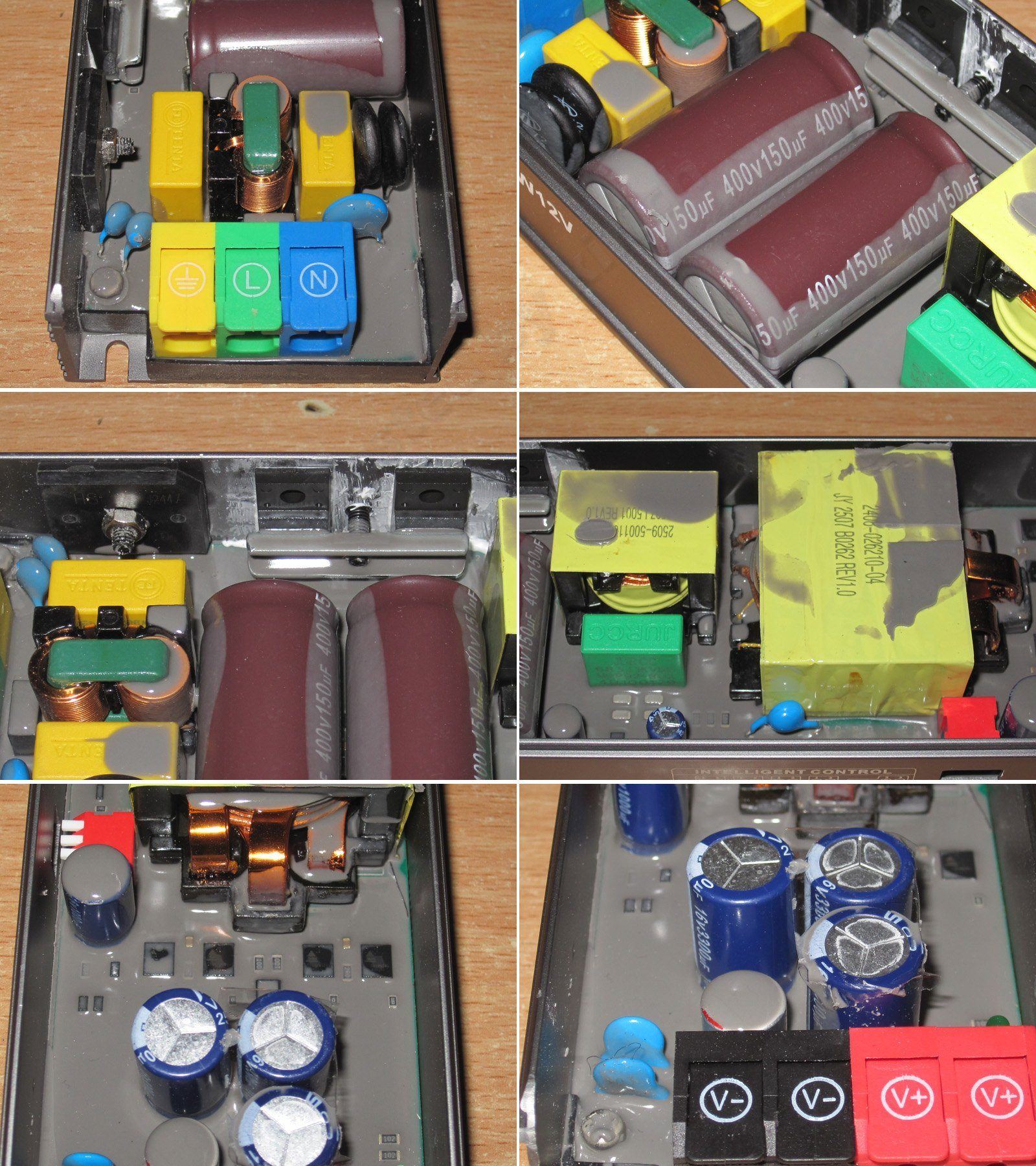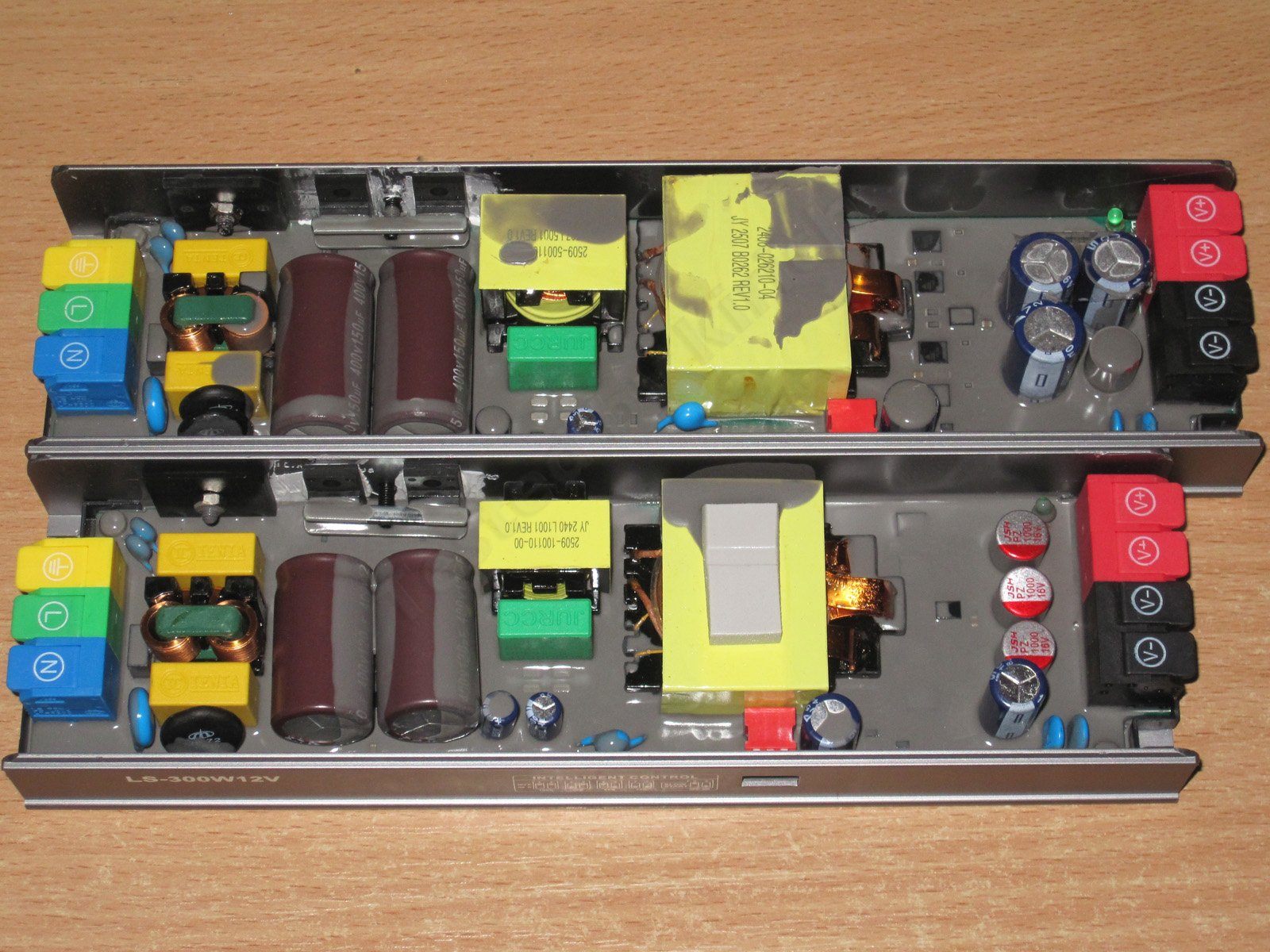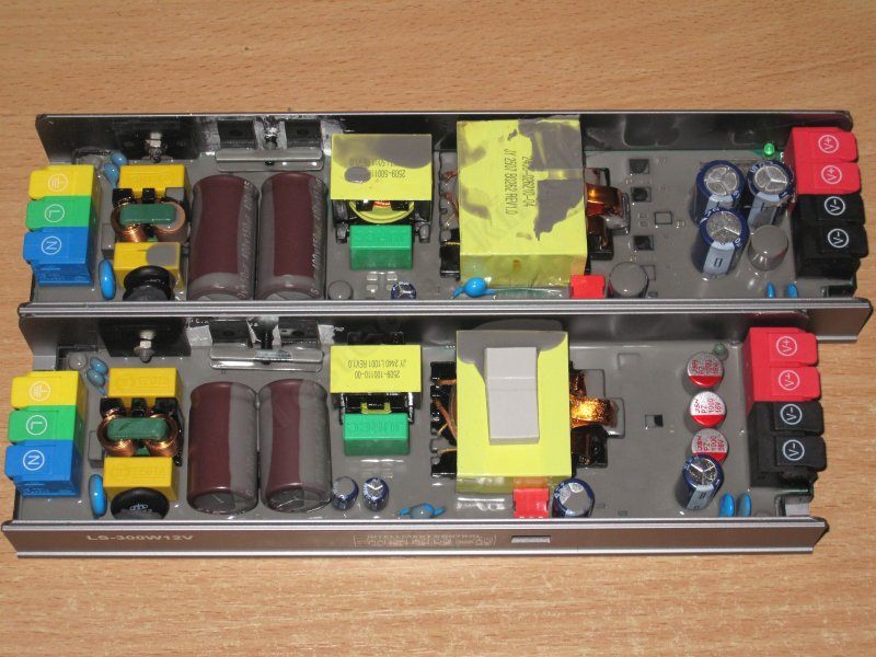 По сути здесь производитель просто увеличил емкость конденсаторов и габаритную мощность дросселя и трансформатора, ну и диодный мост во входу другой, но в общем и целом блоки очень похожи.