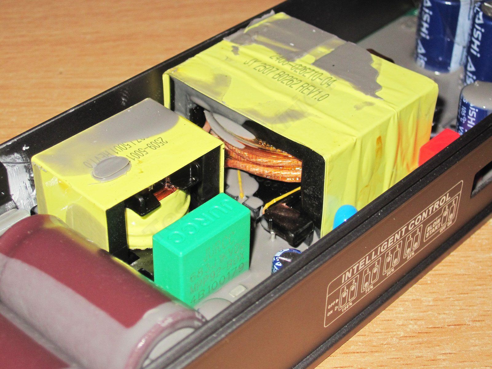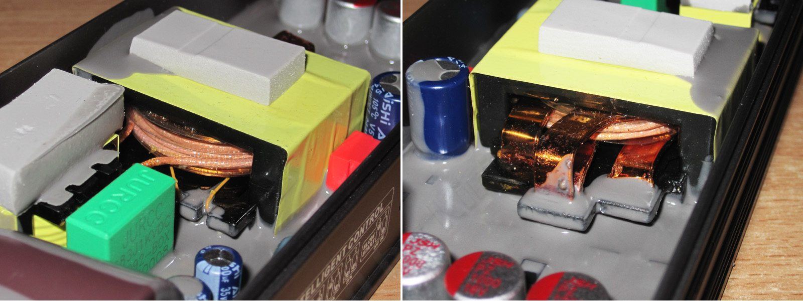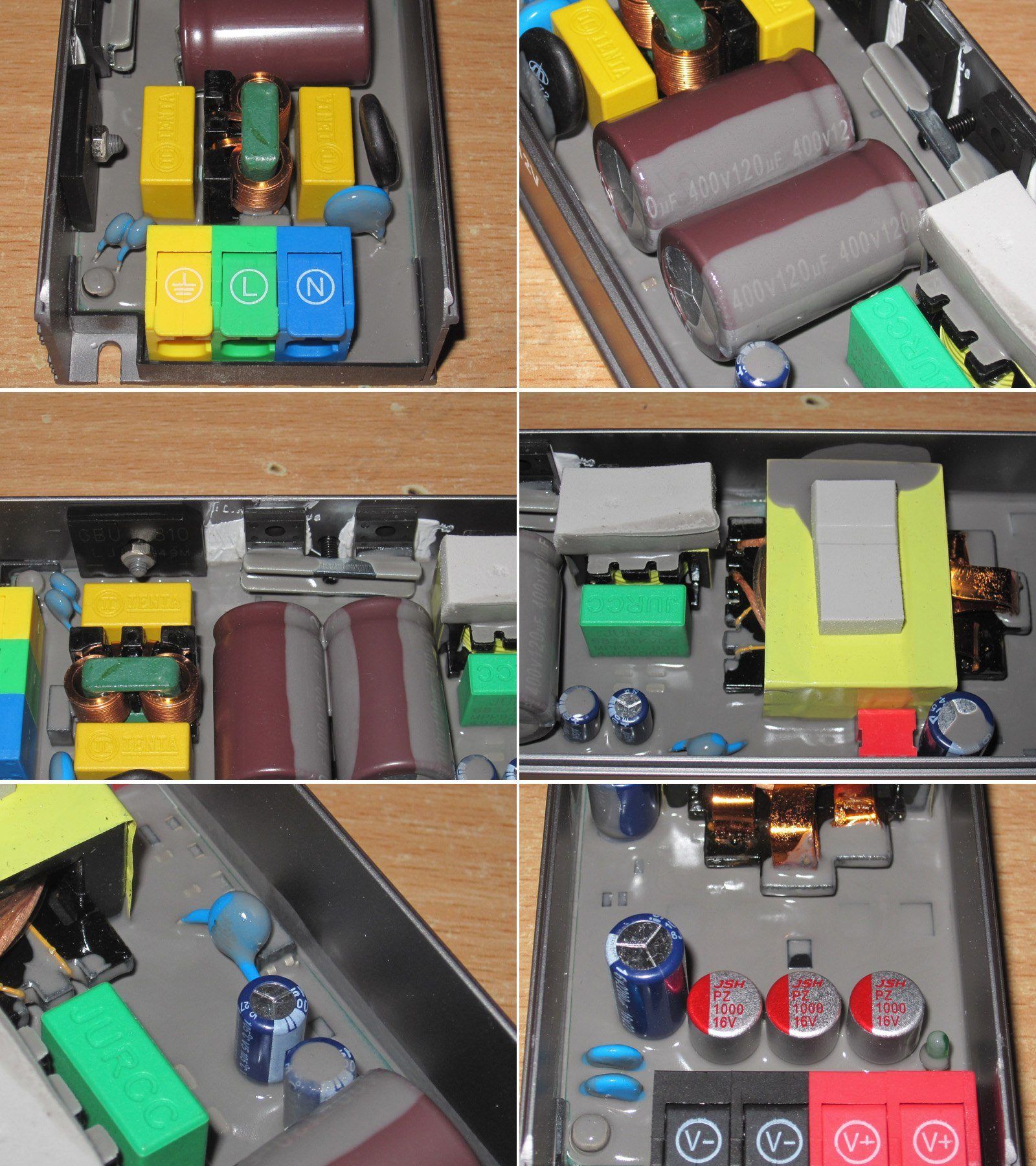 По сути здесь производитель просто увеличил емкость конденсаторов и габаритную мощность дросселя и трансформатора, ну и диодный мост во входу другой, но в общем и целом блоки очень похожи.