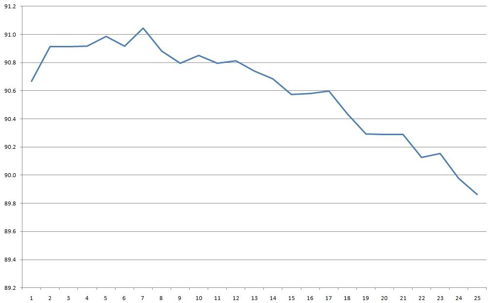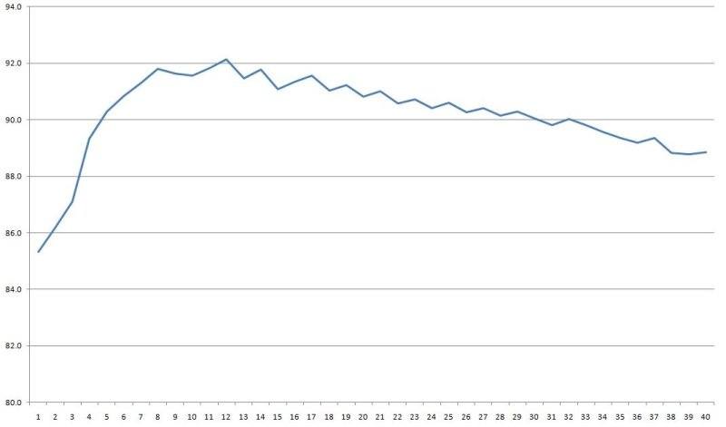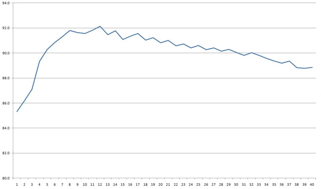 КПД здесь был даже чуть повыше, около 91-92%, но видно что максимальный в районе 150 ватт мощности, дальше КПД падает, но все равно остается относительно высоким.