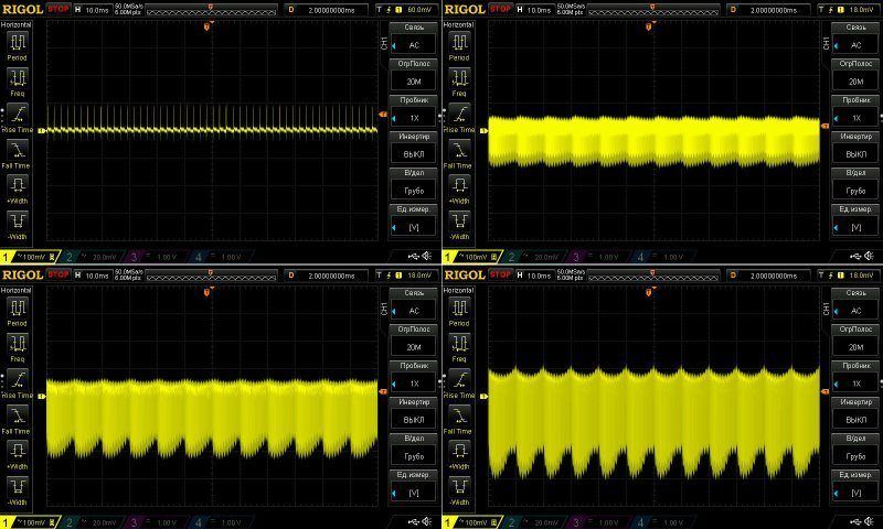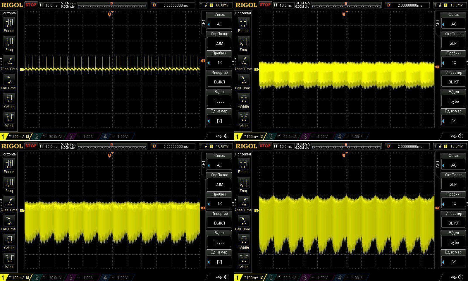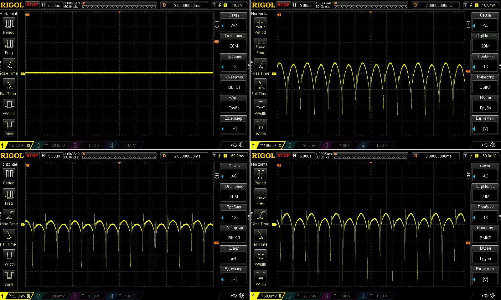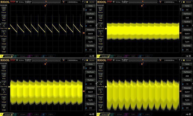 Лучше ситуацию отражает тест с НЧ пульсациями, во первых полный размах получается не более тех же 250-300мВ, во вторых, немного лезут пульсации 100 Гц, на графике они смотрятся грубо, но вы учтите, что выставлено всего 50мВ на клетку, потому вполне нормально.