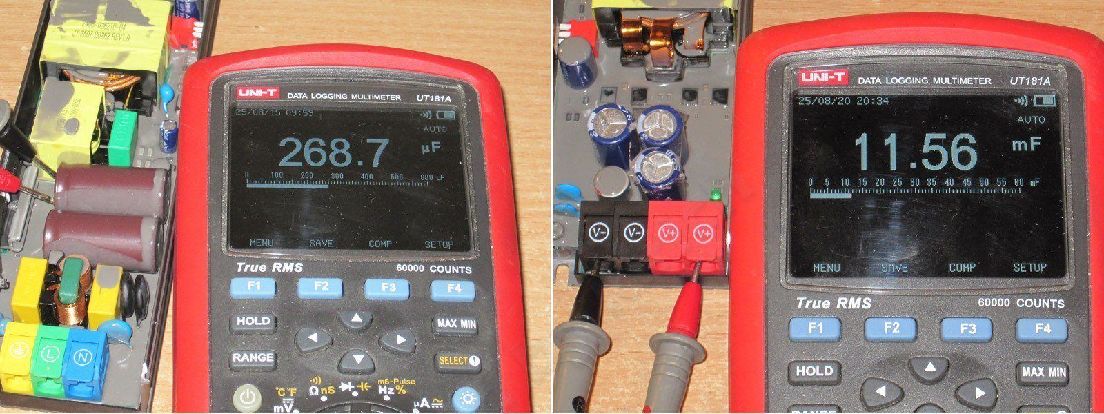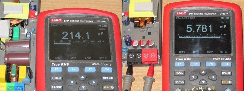 Измеренная емкость входных конденсаторов 214/2=107мкФ при заявленной 120, вполне в пределах погрешности, как самих конденсаторов, так и измерения. У выходных показало 5780мкФ, что также нормально.