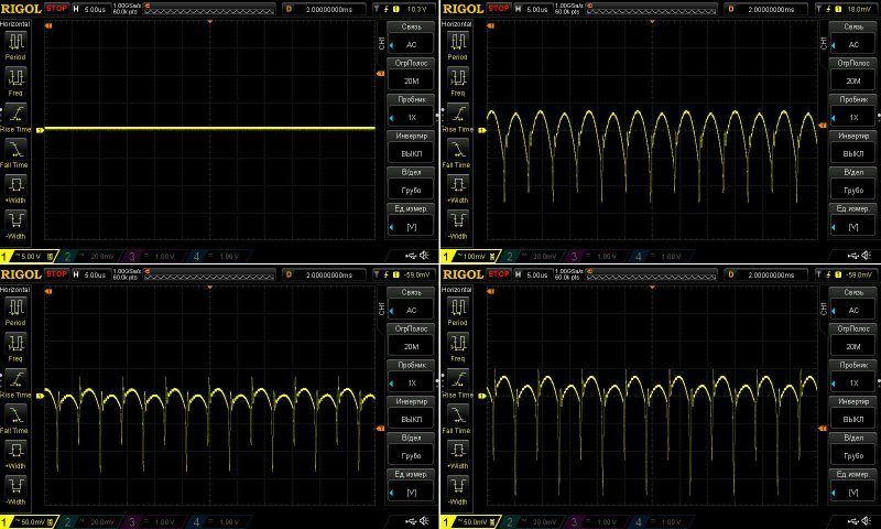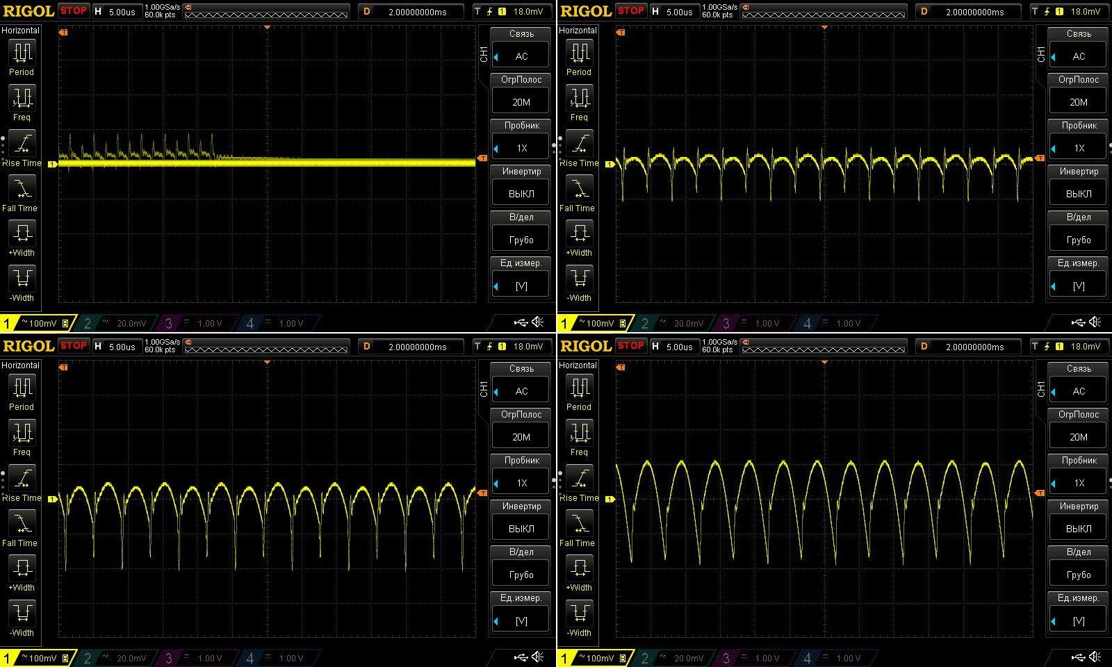 Но суть такая, что полный размах пульсаций во всем диапазоне составляет примерно до 250-300мВ, что для источников питания такой мощности и напряжения вполне нормально.
