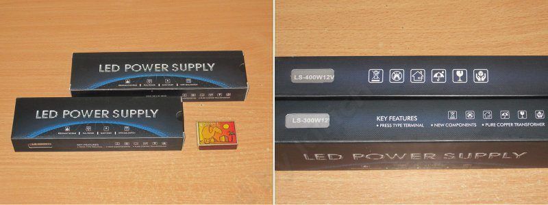 И так, перед нами две модели, обе на 12 вольт, но одна на 300 ватт, вторая на 400. Понравилась надпись на коробке - новые компоненты. Суть в том, что китайцы действительно частенько могут ставить БУ детали, чаще всего конденсаторы с разборки, обычно если вскрыть что-то недорогое, то можно увидеть некий "зоопарк" даже в пределах одной партии. С одной стороны часто ставят фирменные компоненты, с другой, их качество может конечно быть разным.