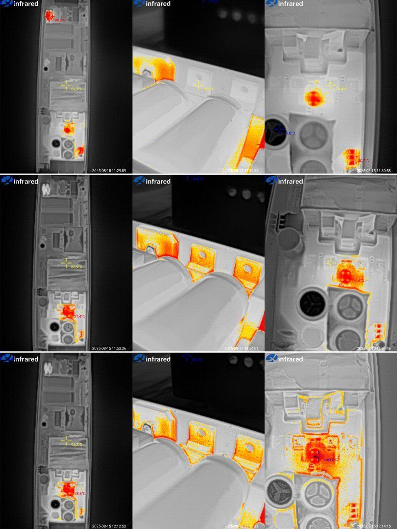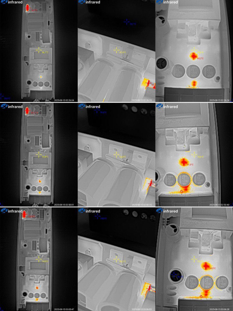 4. Выходной клемник, был заметно горячим, измерение показало максимальную температуру около 74 градуса. Судя по всему клемник на 16А, что суммарно дает 32А максимального тока и для большей нагрузки клемм должно быть 3+3.