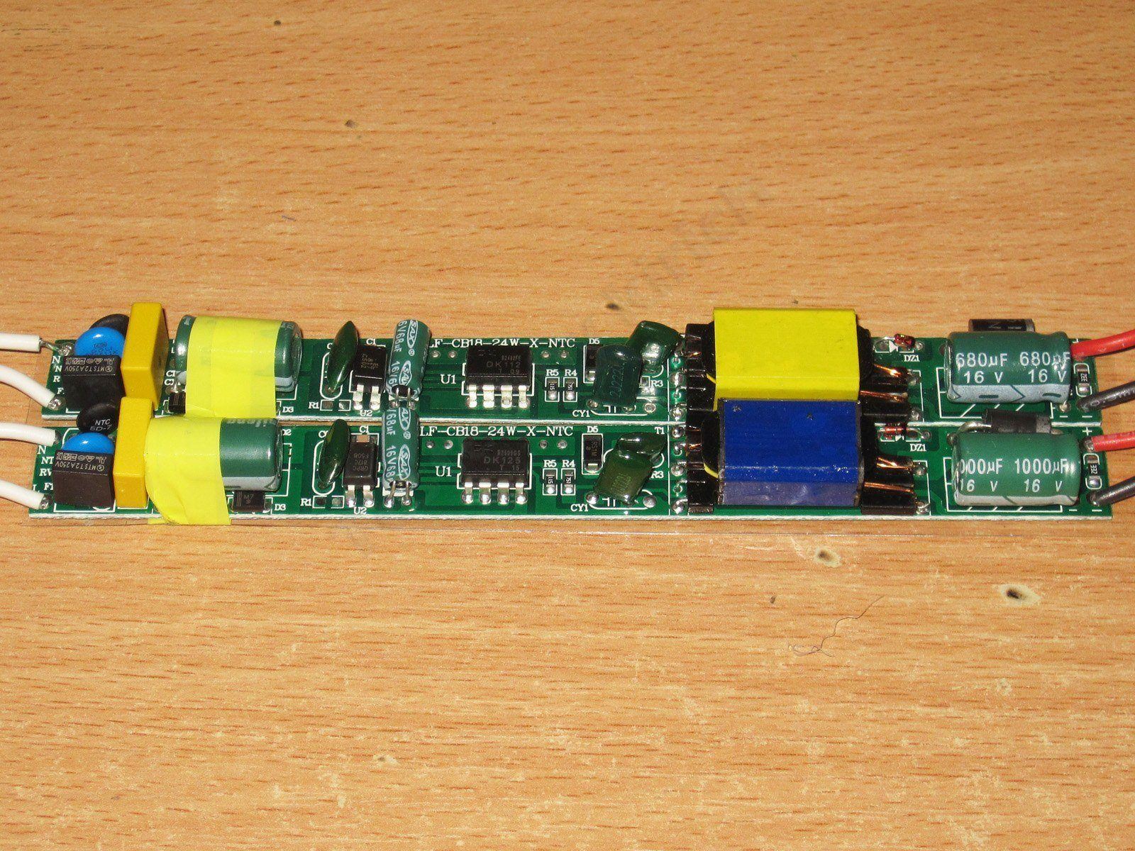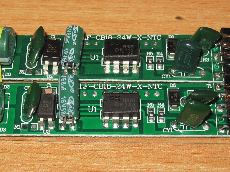 Применен интегрированный ШИМ контроллер, весьма неплохой, у 18 ватт стоит DK112, у 24 ватта DK125 и здесь есть нюанс, первый по даташиту рассчитан на 12/15 ватт, второй на 24, т.е. у первого он будет работать с перегрузкой.