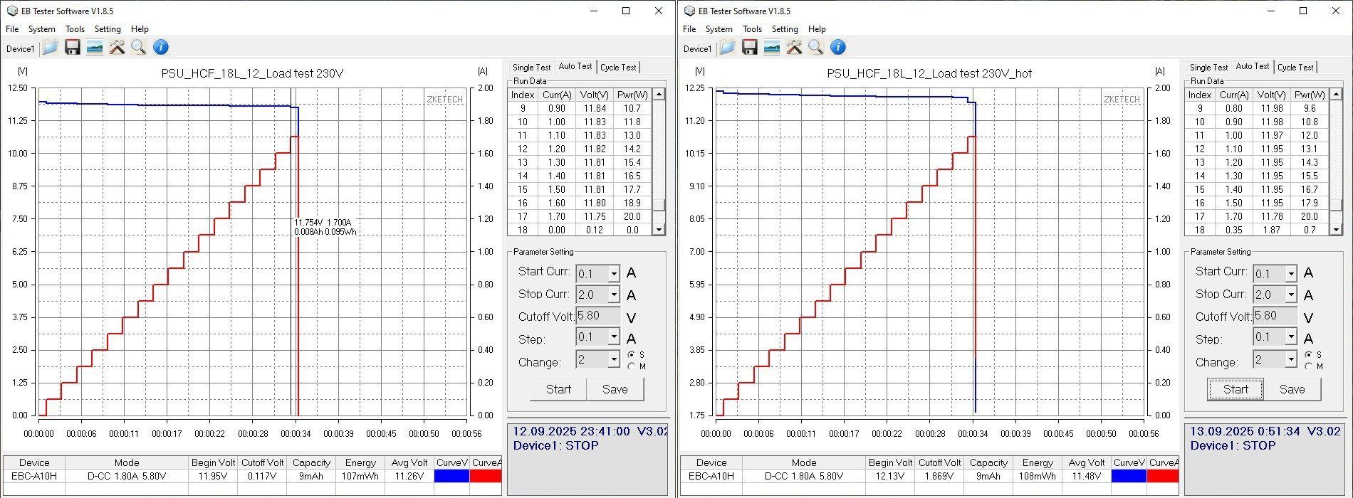 У 18 ватта модели защита срабатывает при 1.7-1.8 ампера что на холодном, что на горячем блоке. Стабильность выходного напряжения весьма неплохая.