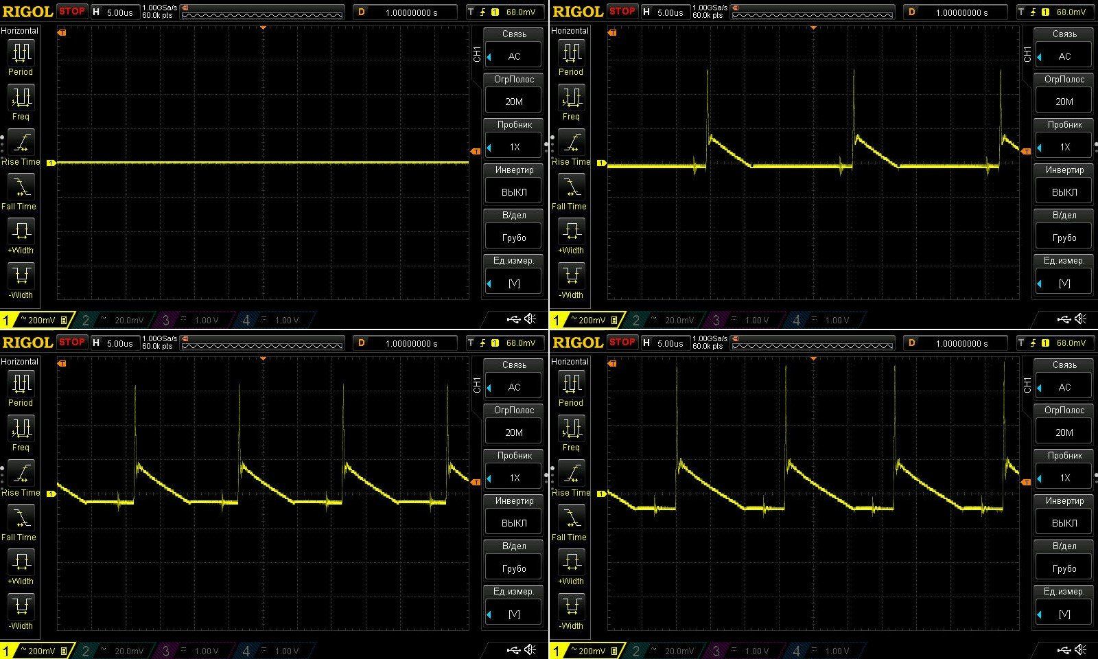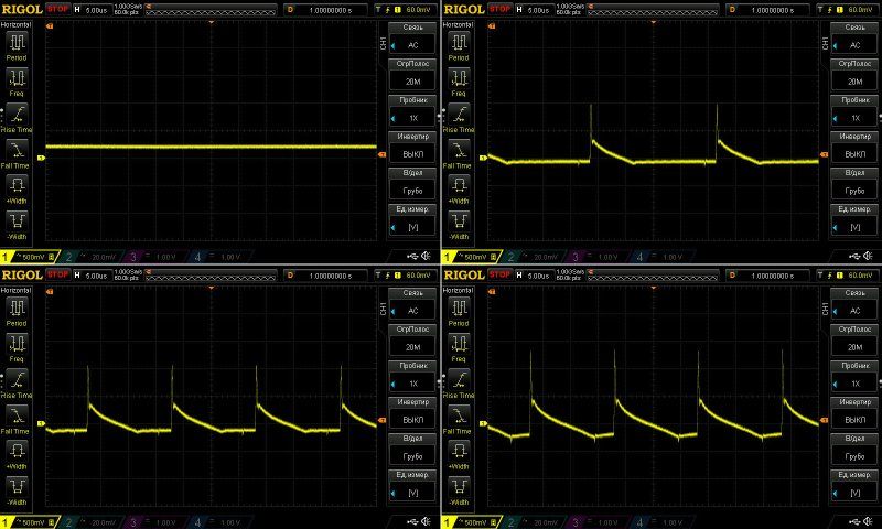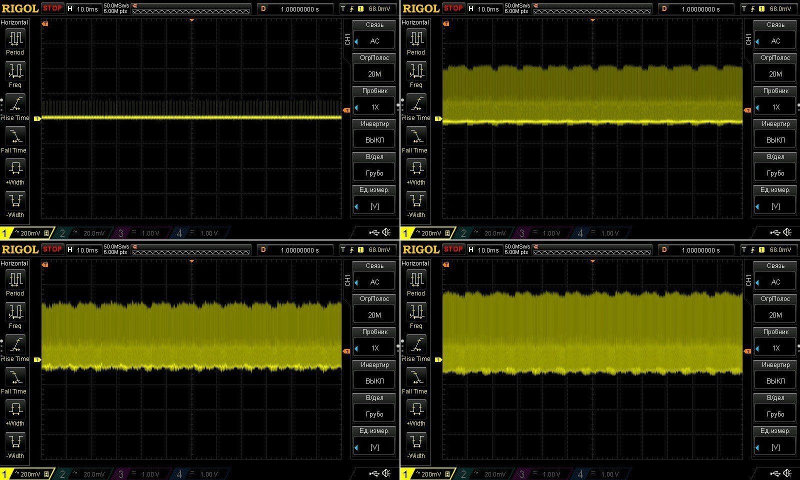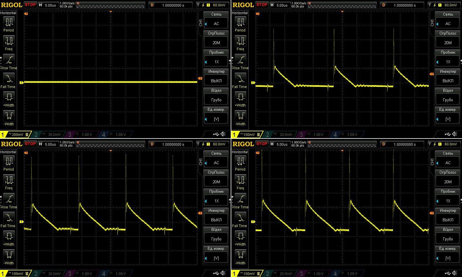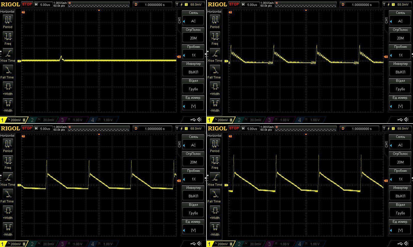 Пульсации без нагрузки и при токах 2, 4 и 6 ампер.