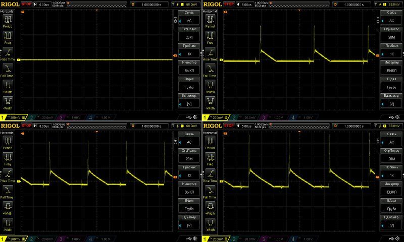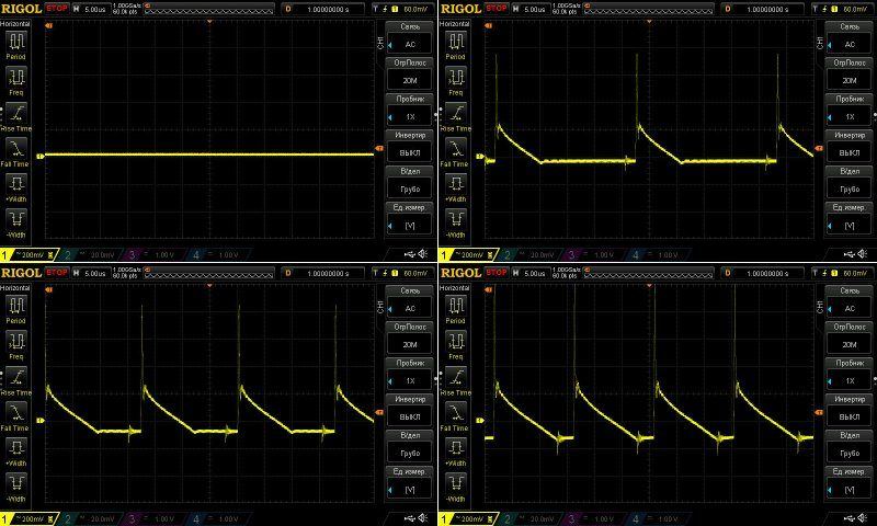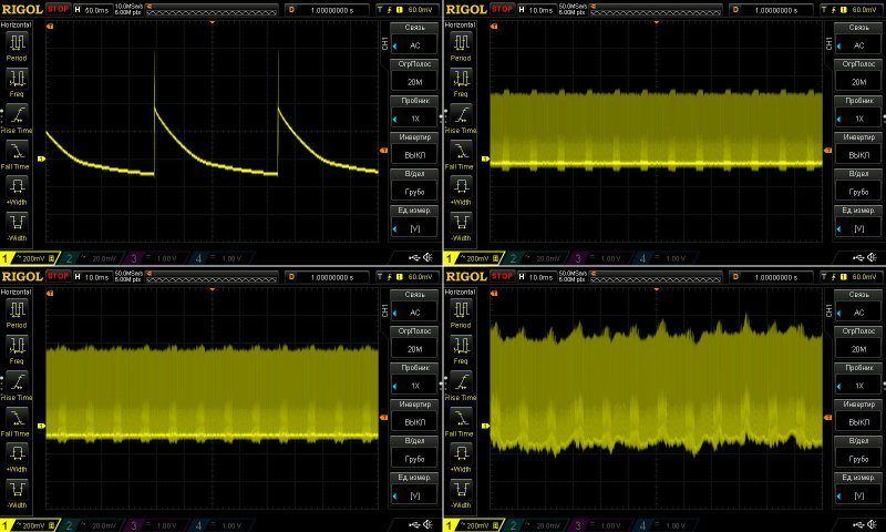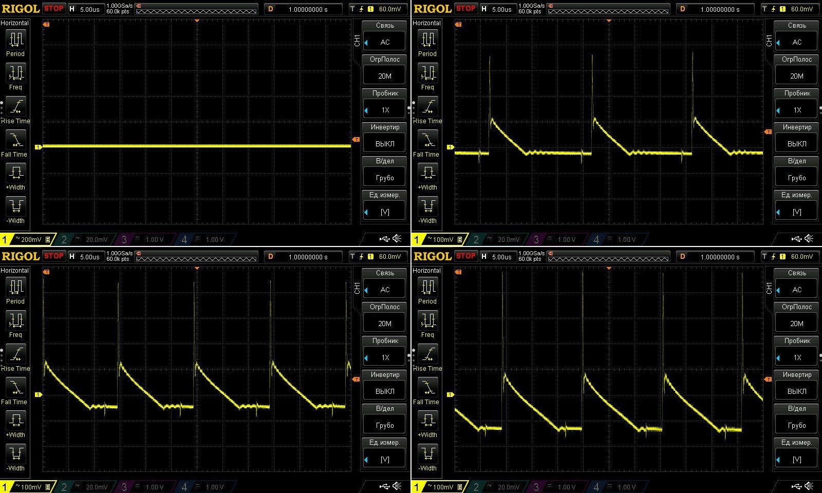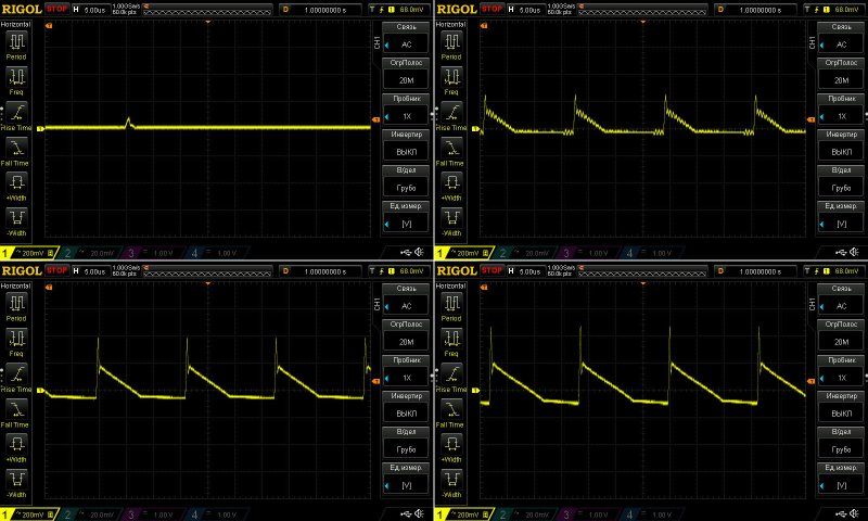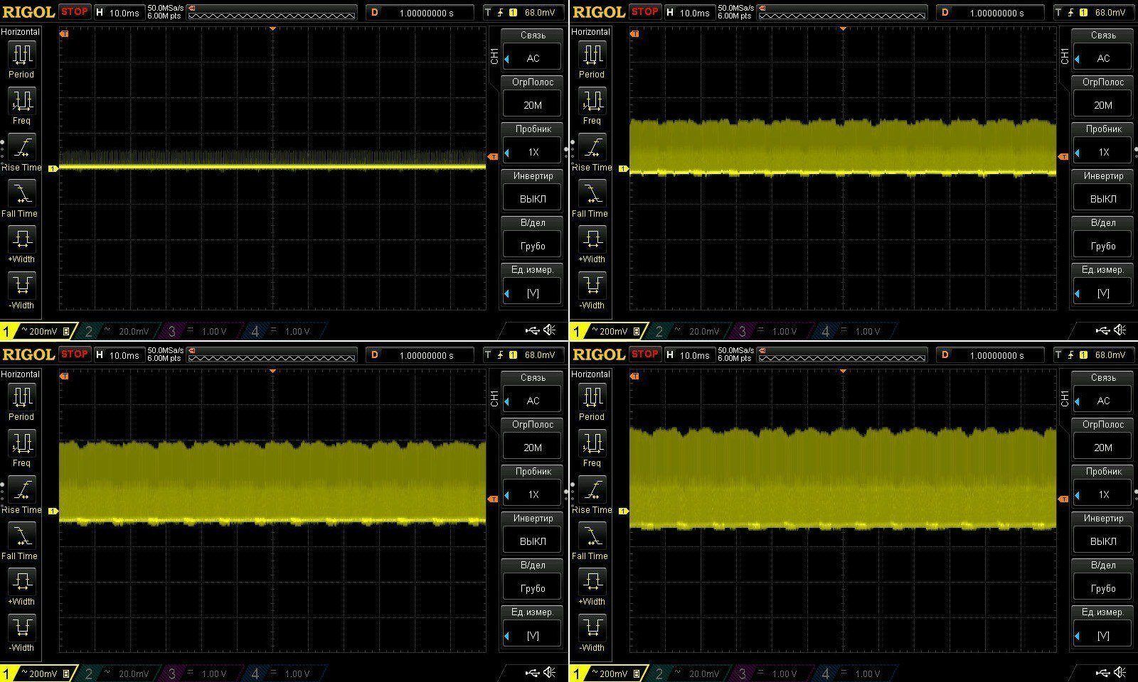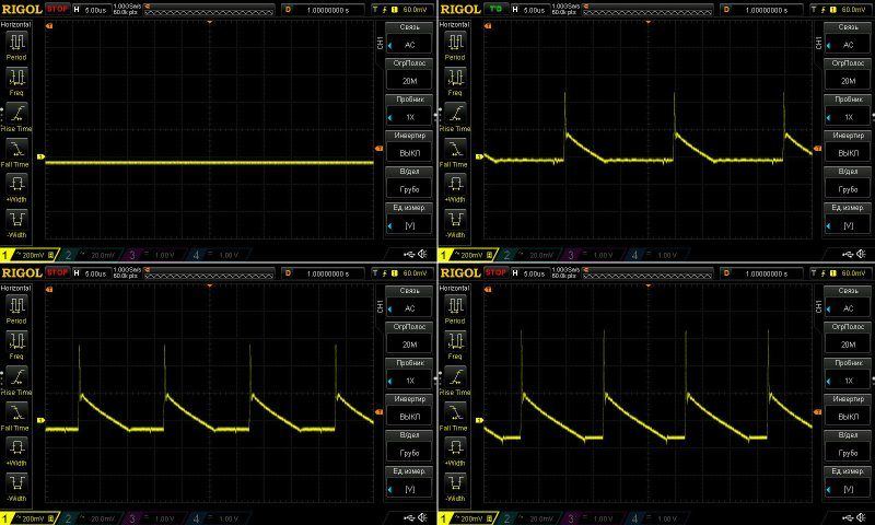 Пульсации без нагрузки и при токах 2, 4 и 6 ампер.