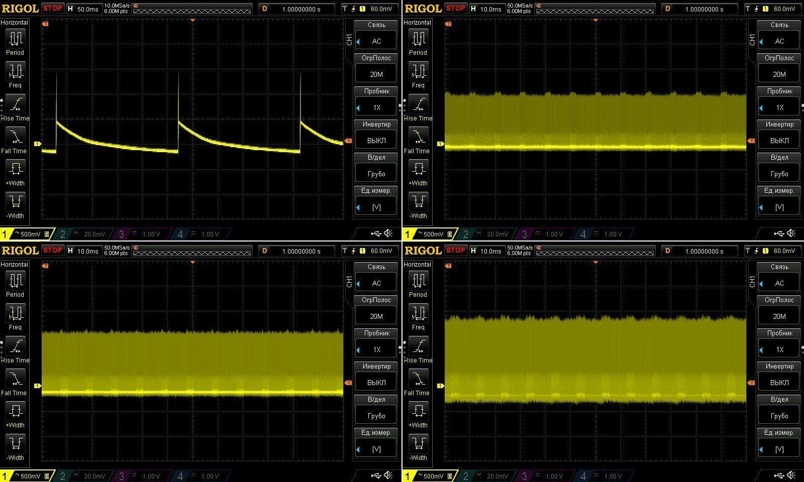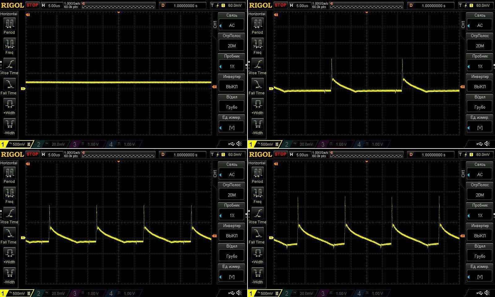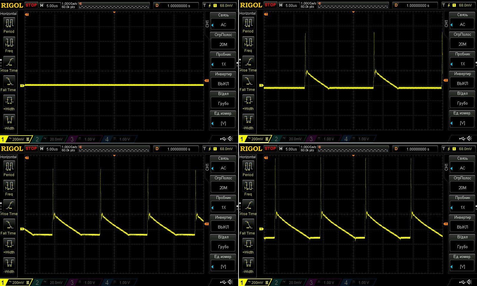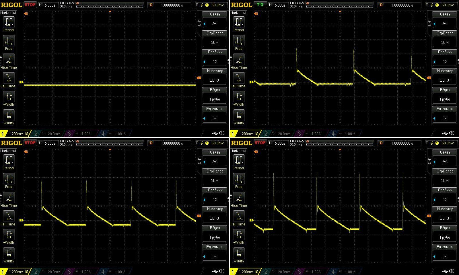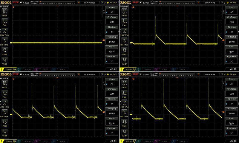 Пульсации без нагрузки и при токах 2, 4 и 6 ампер.