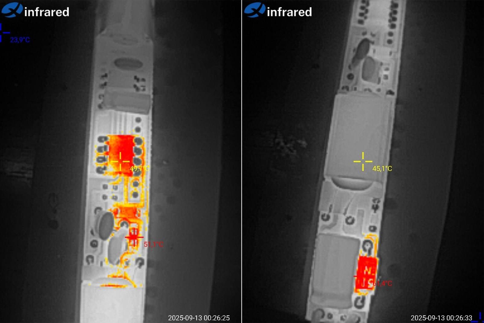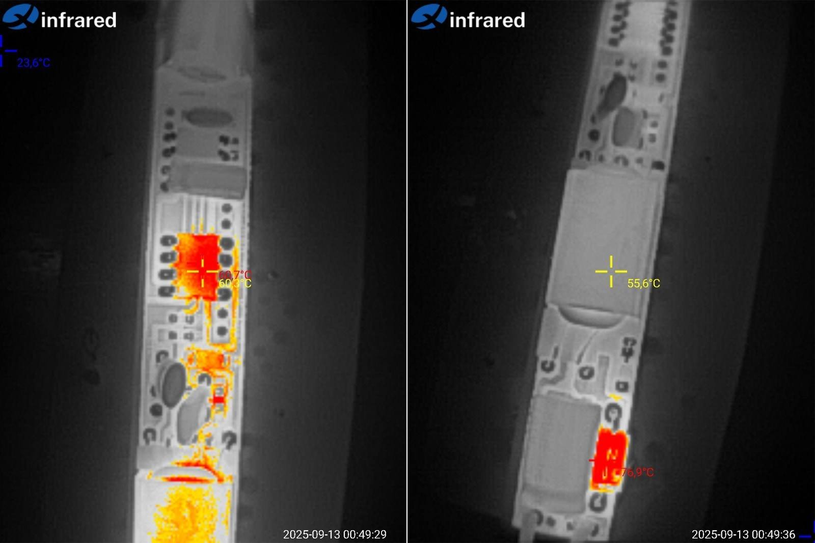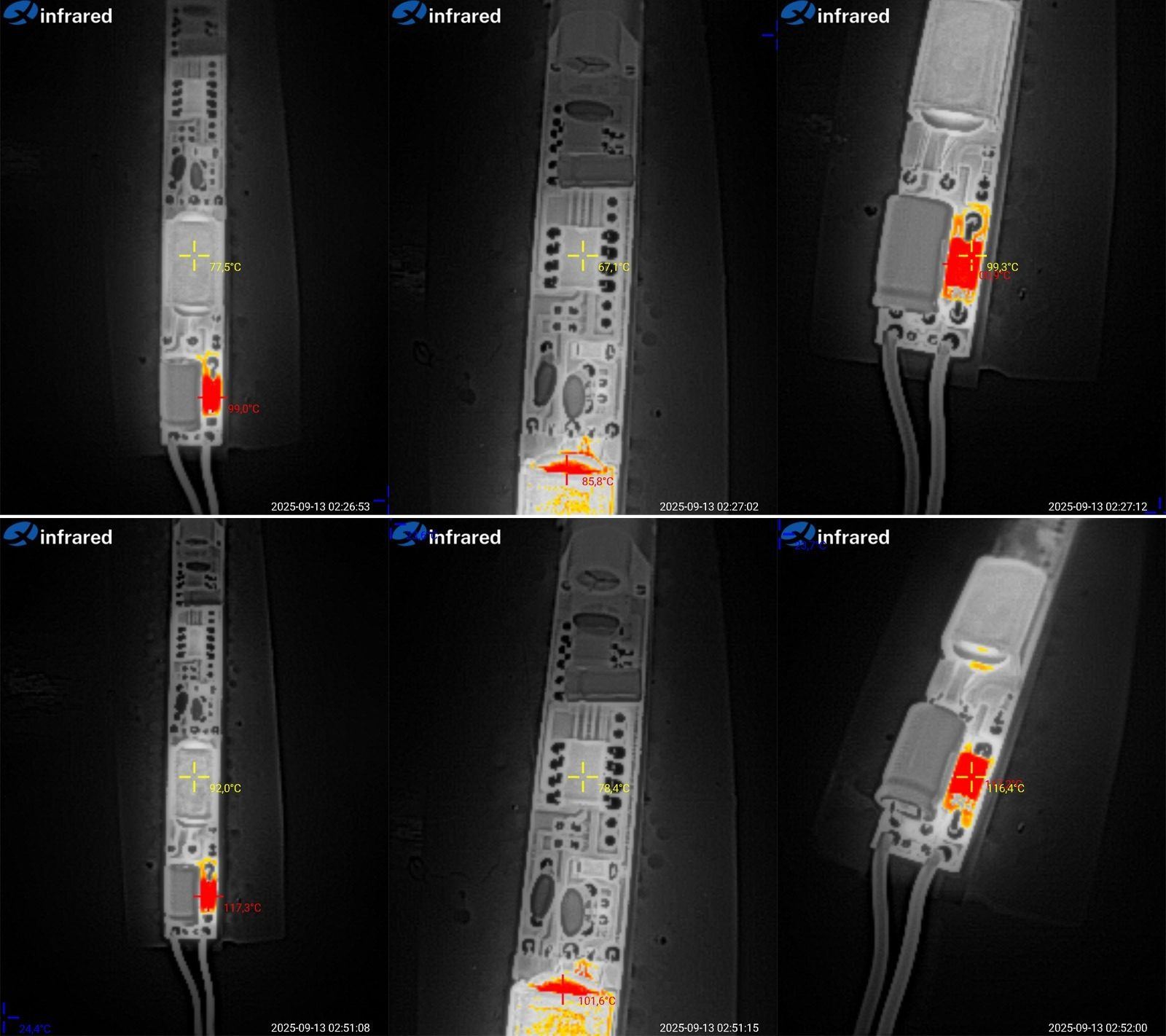 Опять же, из-за сложности измерения температур в закрытом состоянии мне пришлось измерять температуру голой платы, лежащей на столе, потому думаю что когда плата будет стоять в корпусе, температуры будут больше. Суть в том, что у подобных блоков питания, но залитых компаундом, значительная часть тепла передается на корпус, что улучшает охлаждение. Здесь же наоборот, корпус хоть и из металла, но тепло на него передается за счет воздуха.