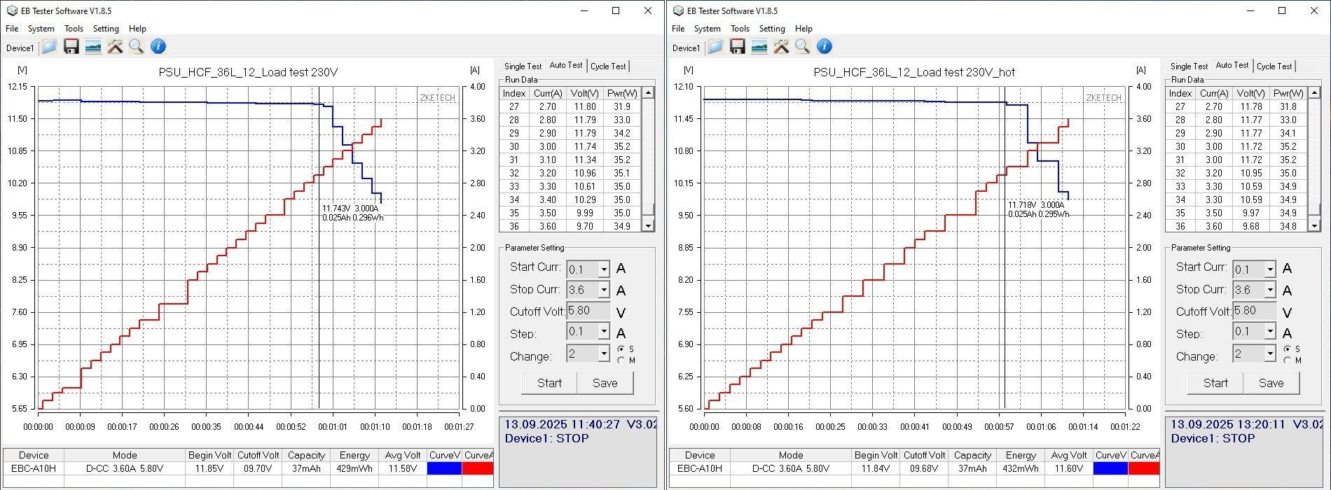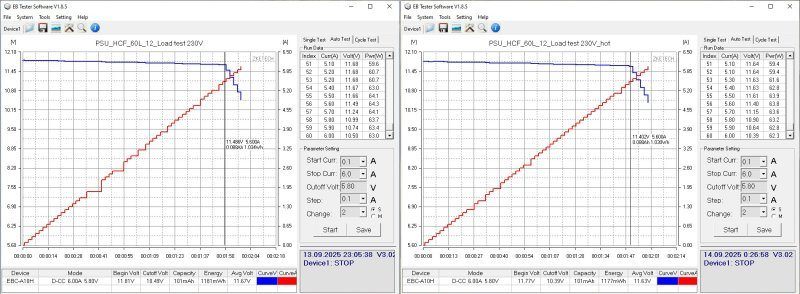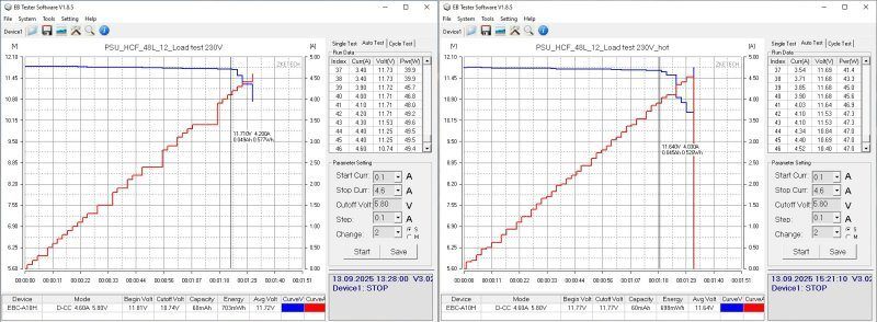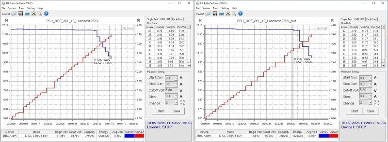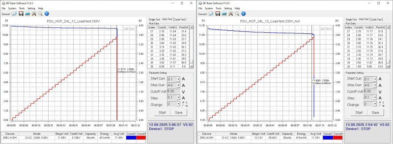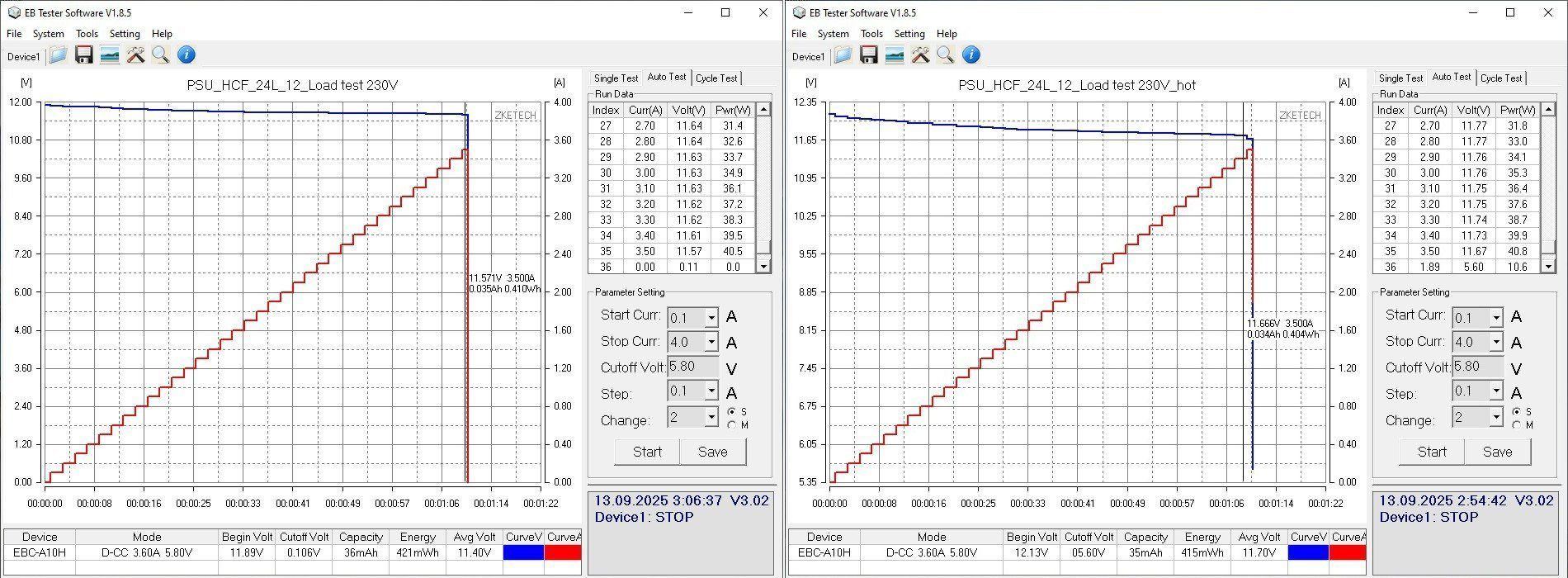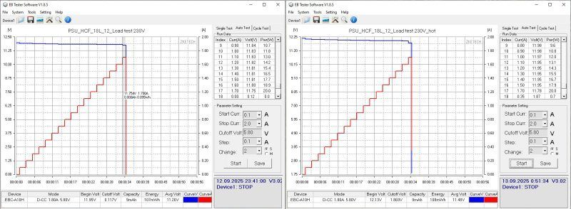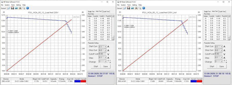 Блок питания имеет небольшую положительную зависимость напряжения от температуры, в итоге начав с 11.98 на холодном он закончил на тех же 11.98 вольта после прогрева, компенсировав в итоге падение на проводах, потому как сам БП при изменении нагрузки от 0 до 100% просаживал напряжение на 50мВ.