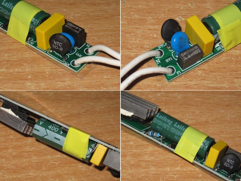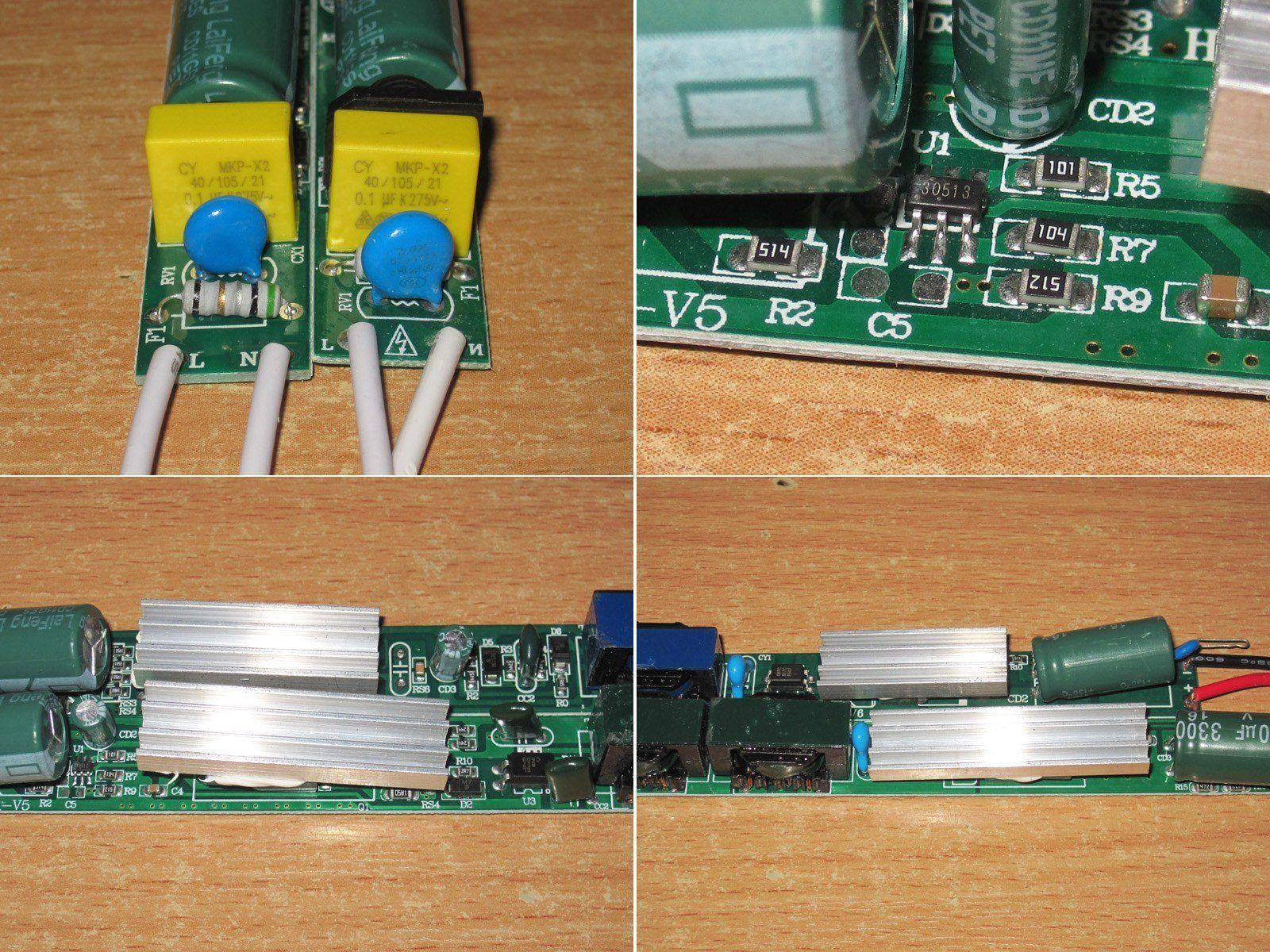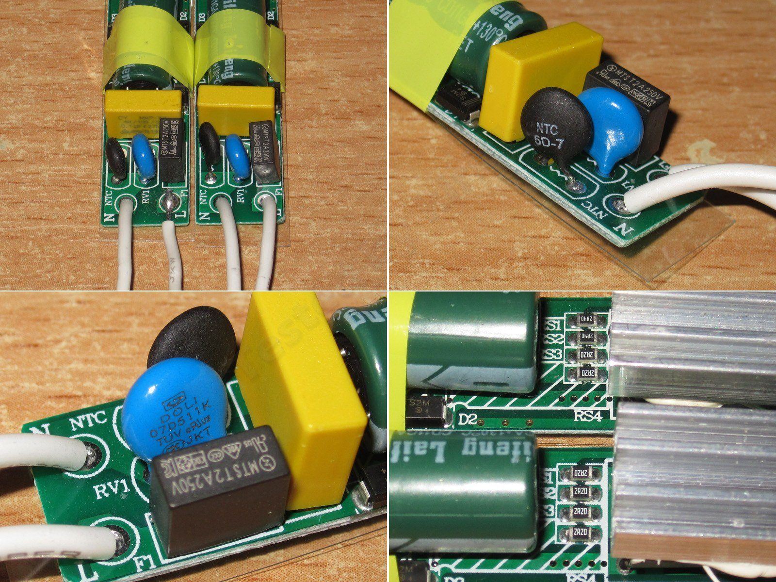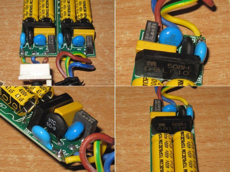 На входе у обоих плат есть варистор, по моему на 560 вольт амплитудного, Х-конденсатор и резистор в качестве ограничителя тока и предохранителя. В общем тут как-то странно, даже у 18 ватт версий был термистор и нормальный предохранитель, а тут решили сэкономить?