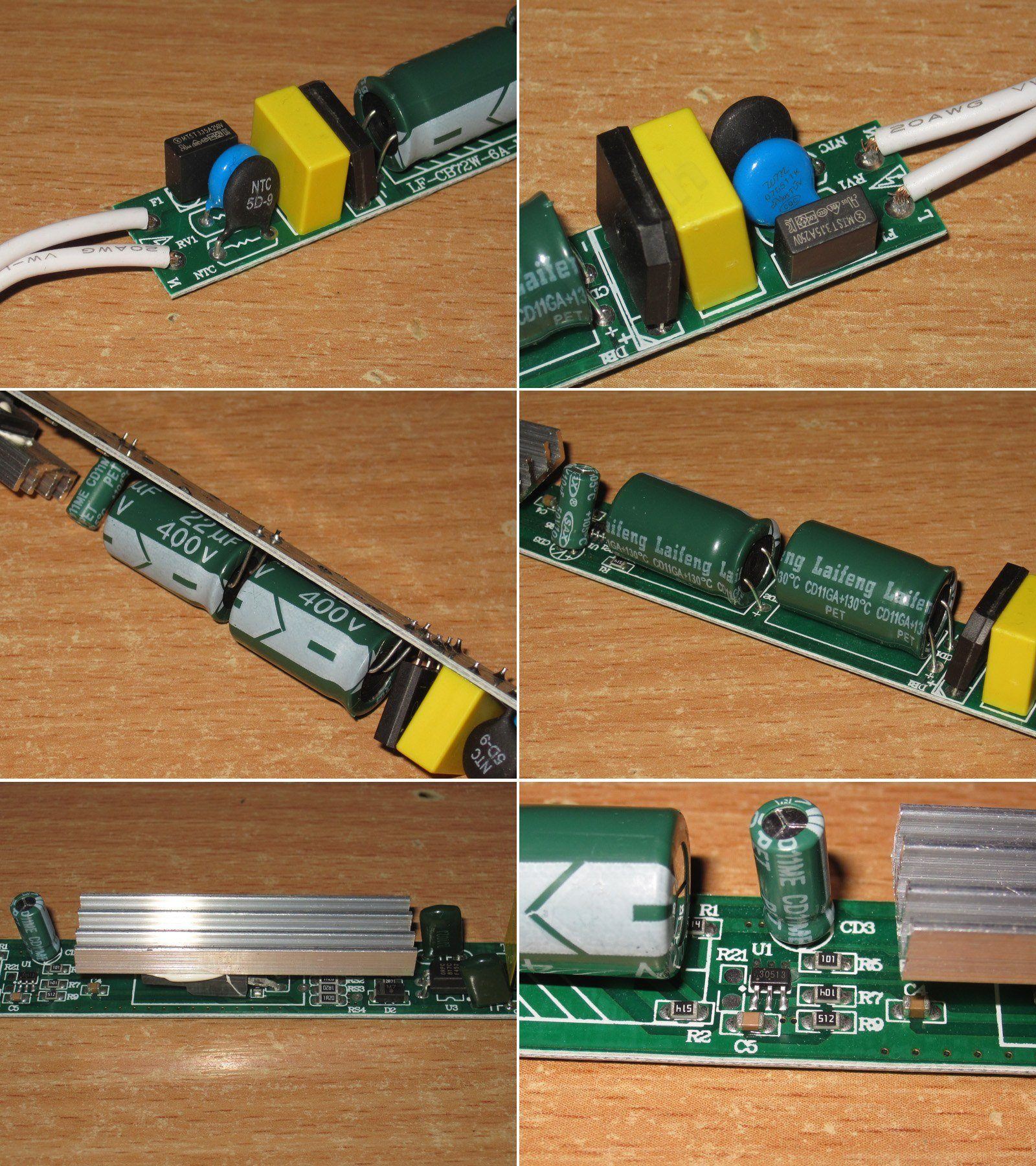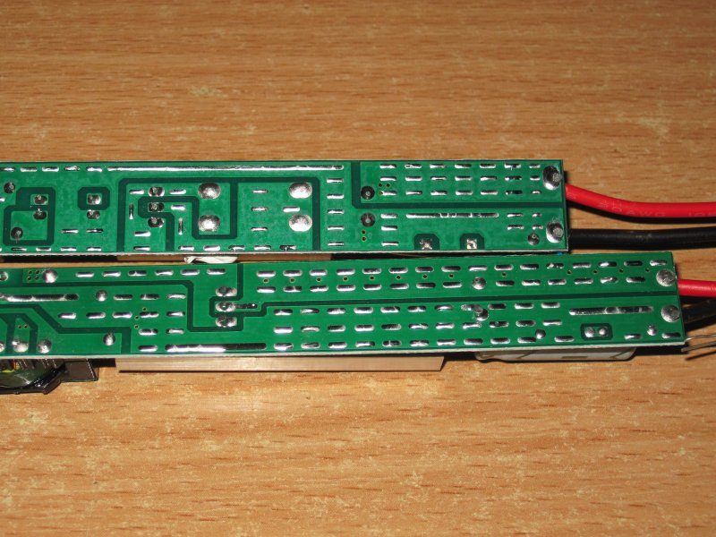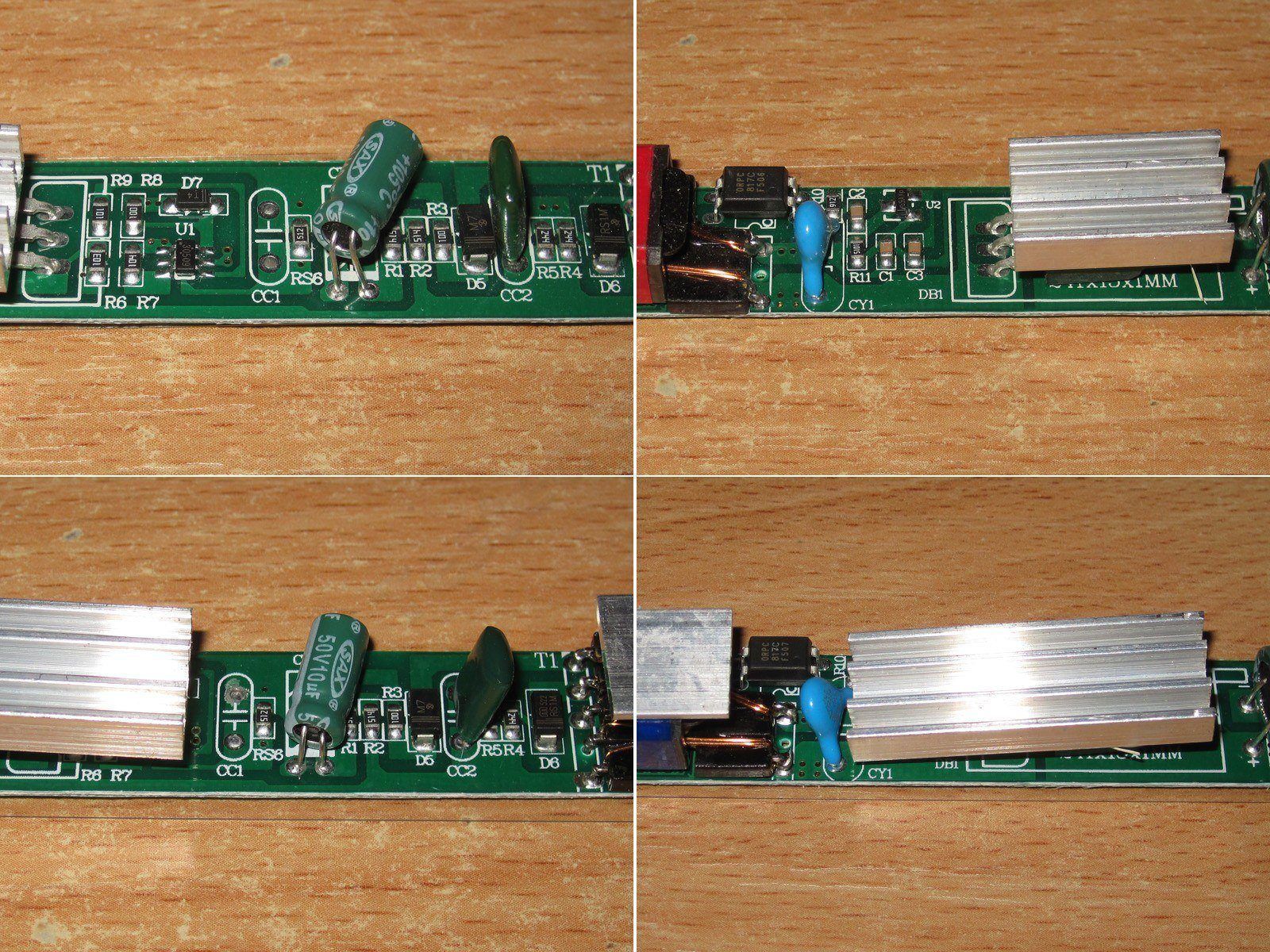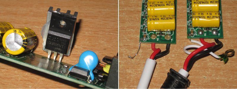 На входе у обоих плат есть варистор, по моему на 560 вольт амплитудного, Х-конденсатор и резистор в качестве ограничителя тока и предохранителя. В общем тут как-то странно, даже у 18 ватт версий был термистор и нормальный предохранитель, а тут решили сэкономить?