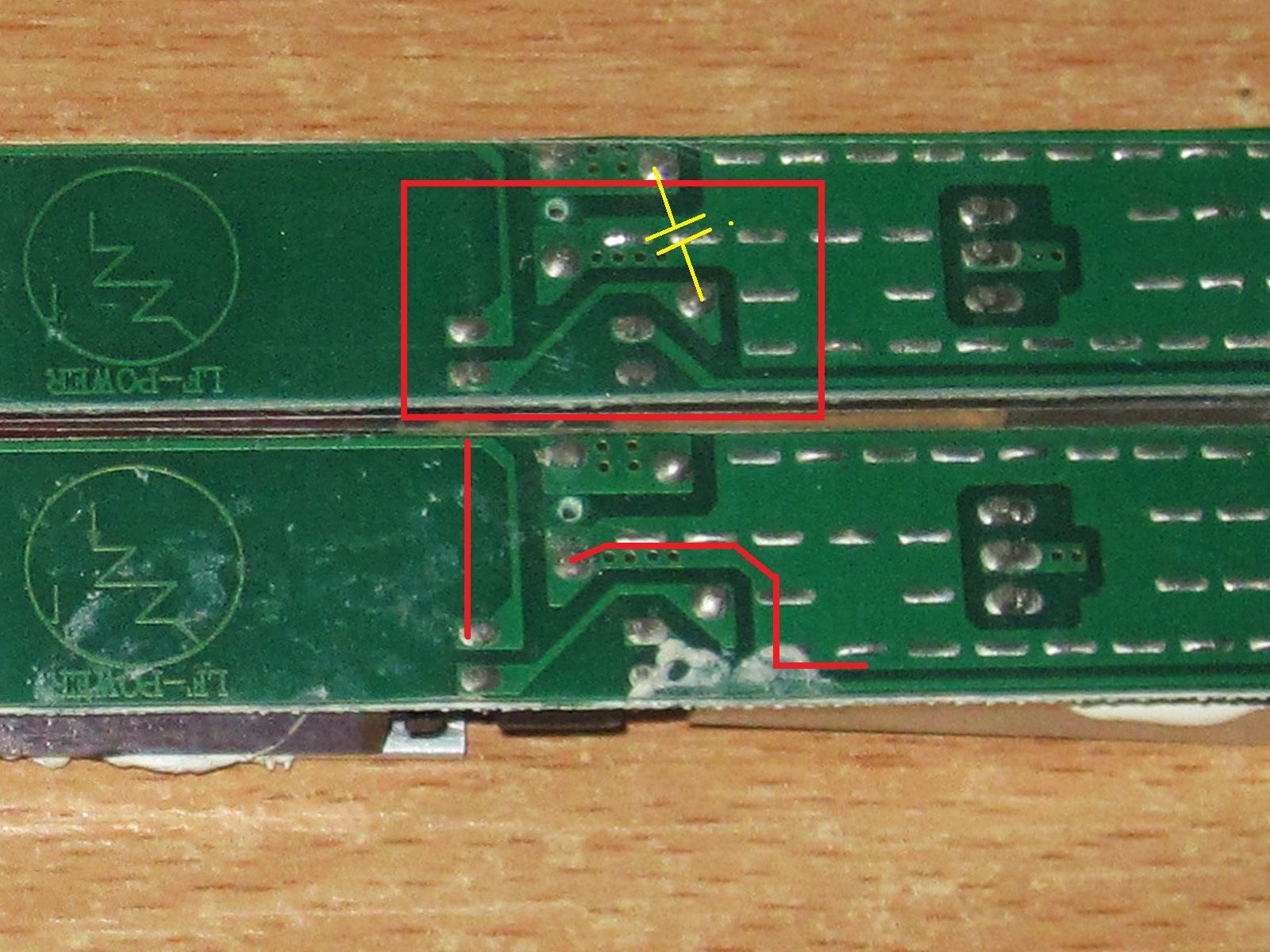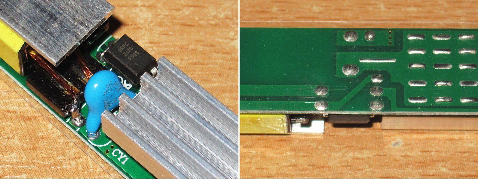 Суть в том, что все равно получились маленькие зазоры, на фото обозначен Y-конденсатор, ниже выводы оптрона.