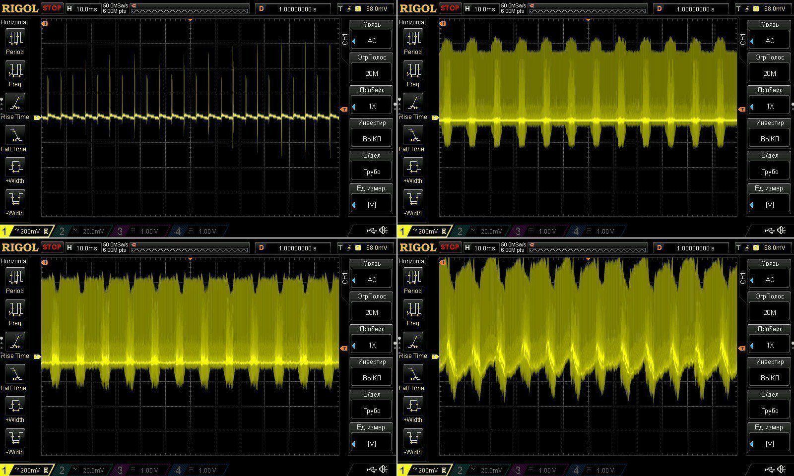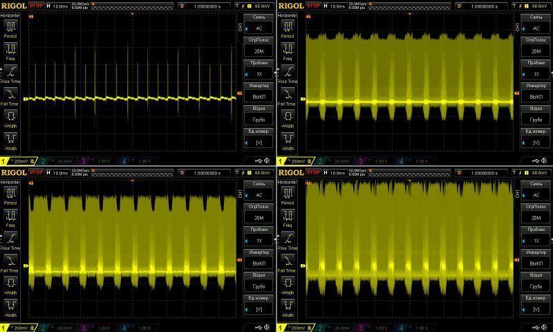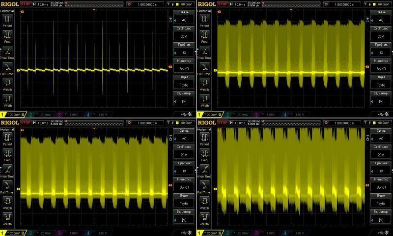 На низкой частоте видны характерные пульсации без нагрузки и теперь я склонен считать, что это характерная особенность примененного ШИМ контроллера, потому как такое мы уже видели ранее.