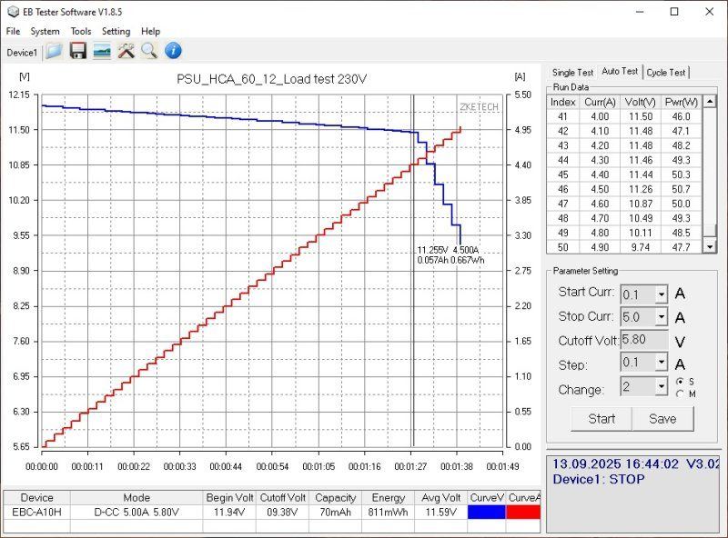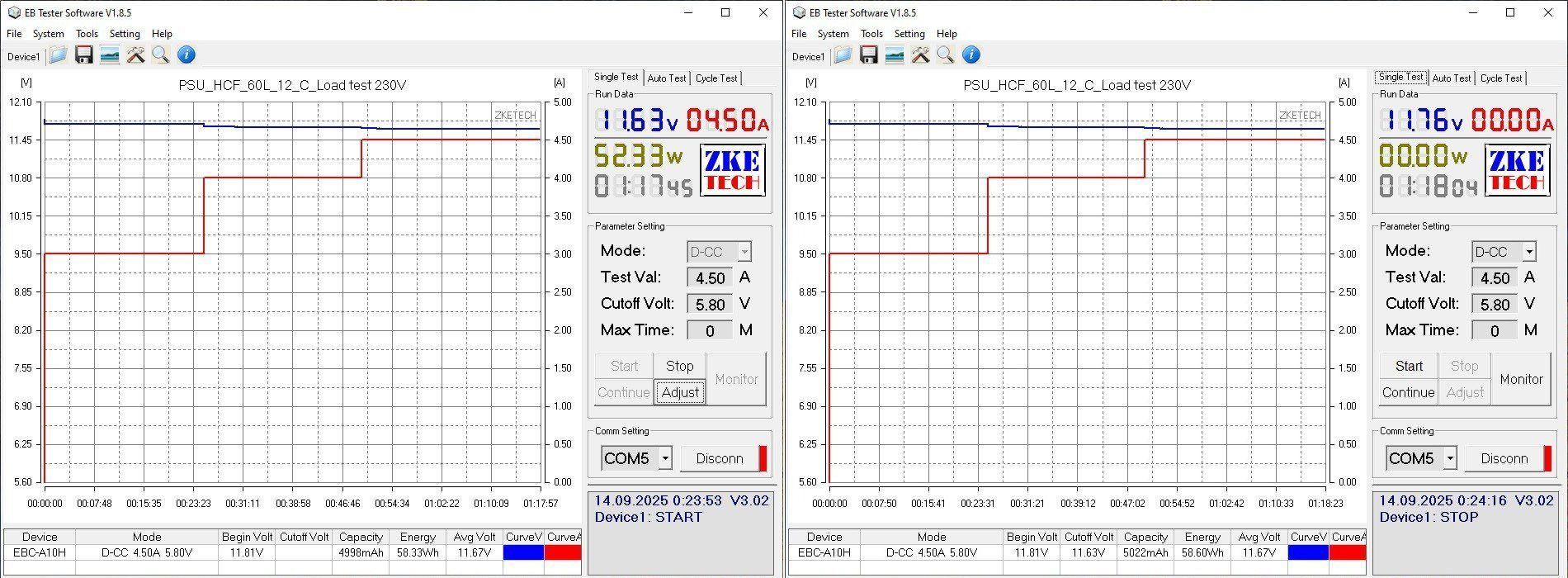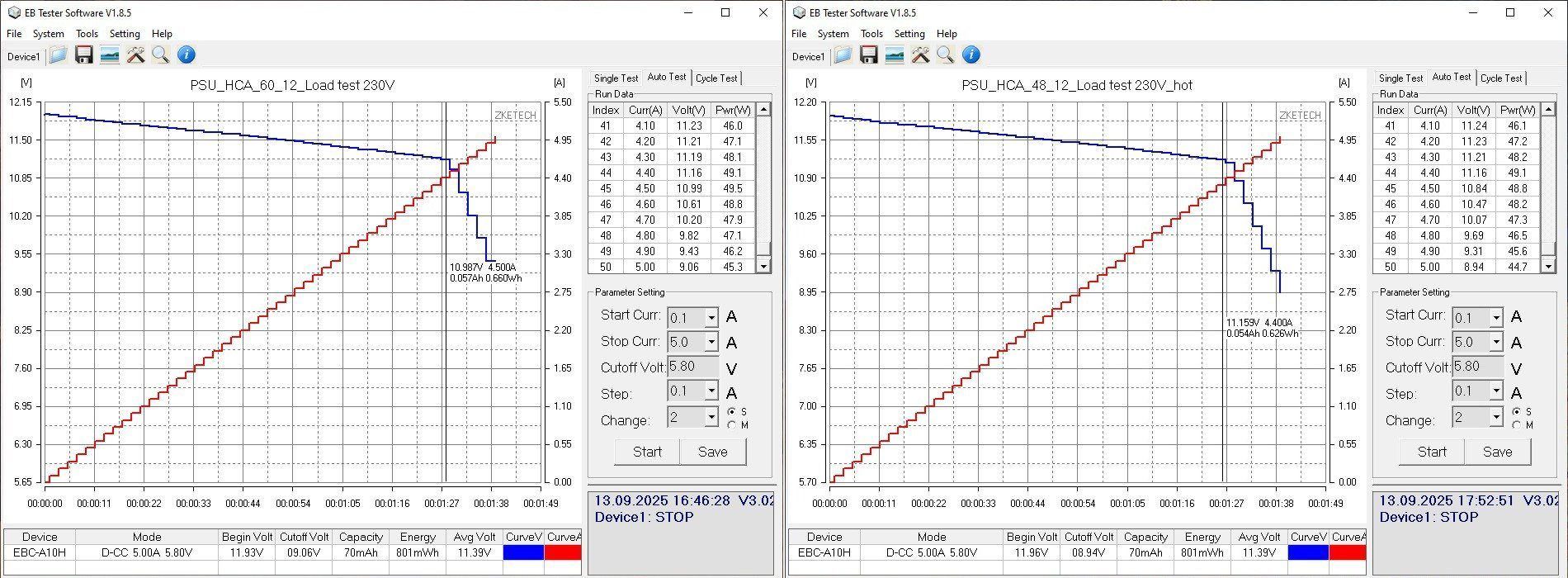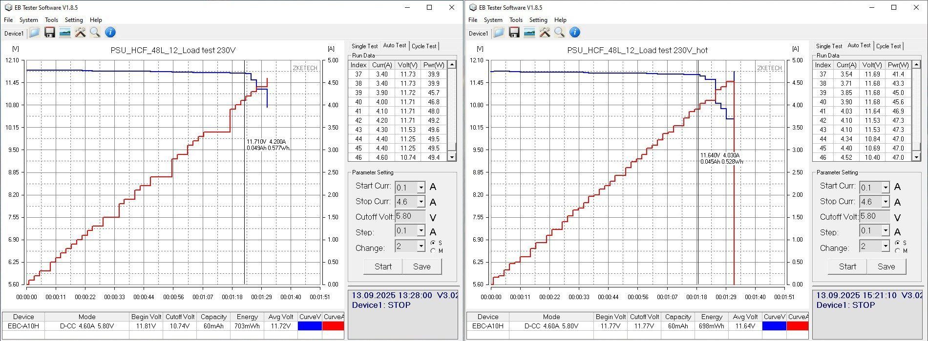 Нагрузочный тест проходил в три этапа, при токах 3, 4 и 4.5А, заявленные 5 ампер не стал давать, потому как уже при 4.5А блоку пришлось тяжело.