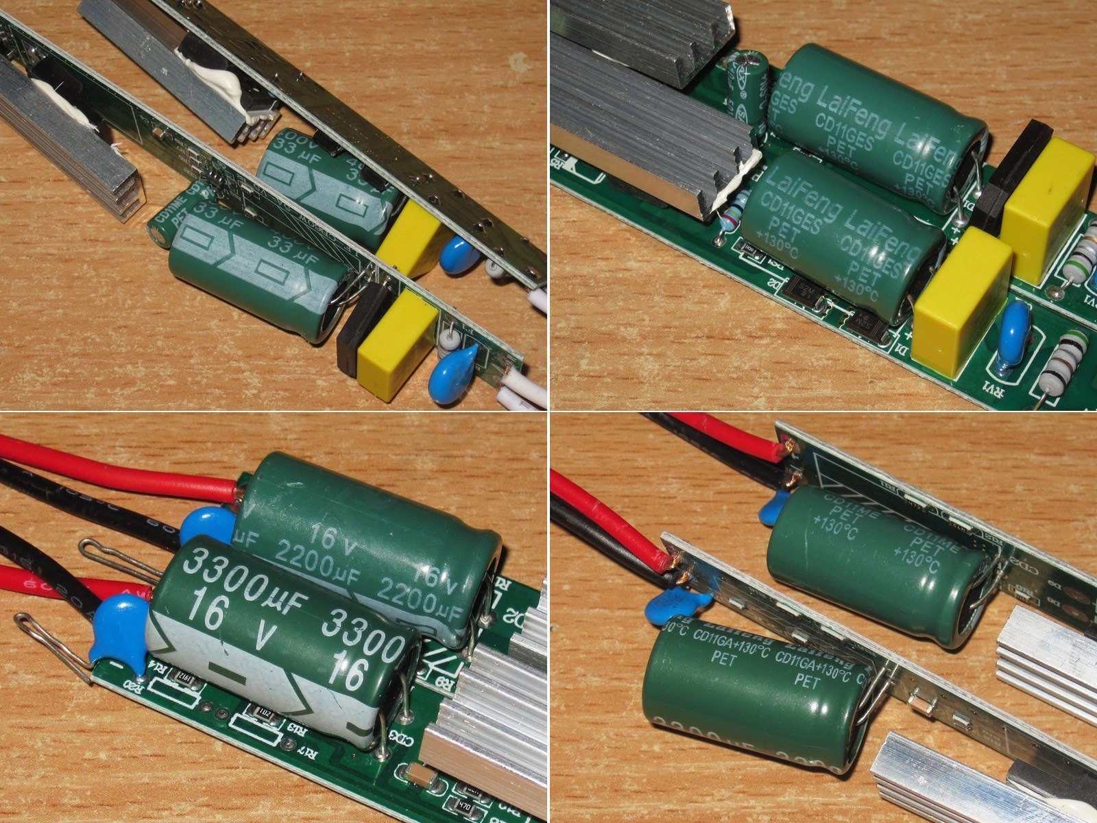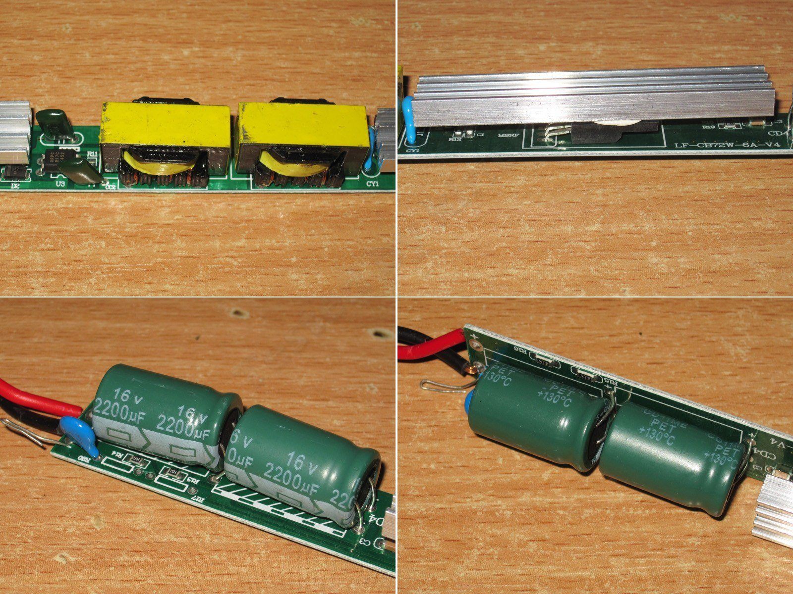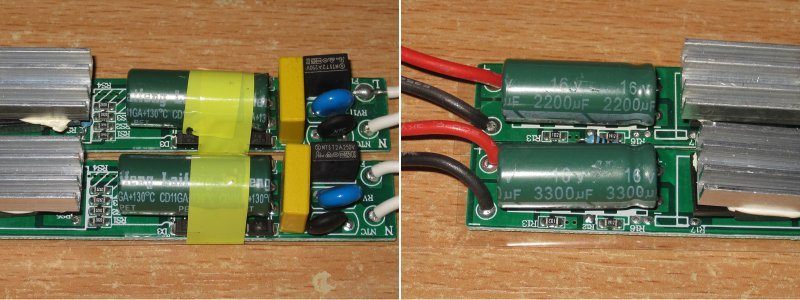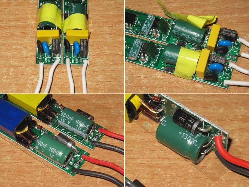 По выходу конденсаторы также отличаются, 680мкФ у 18 ватт модели и 1000мкФ у 24 ватта, и они также на 130 градусов.