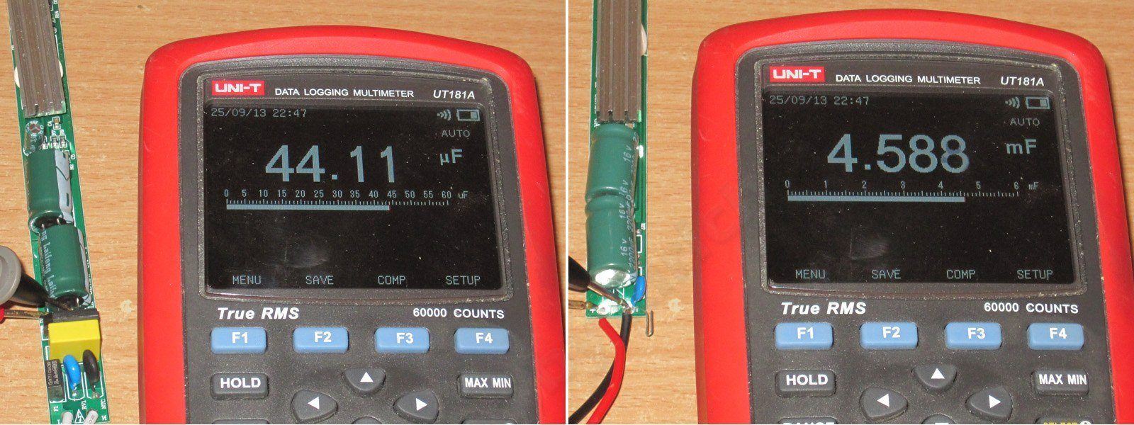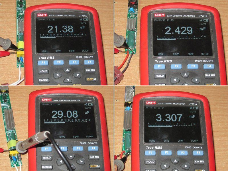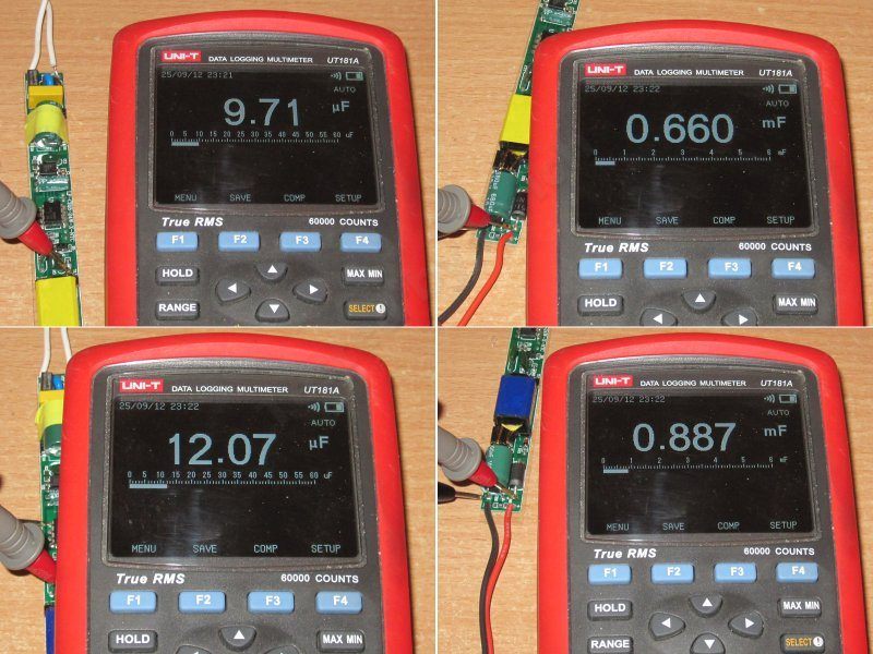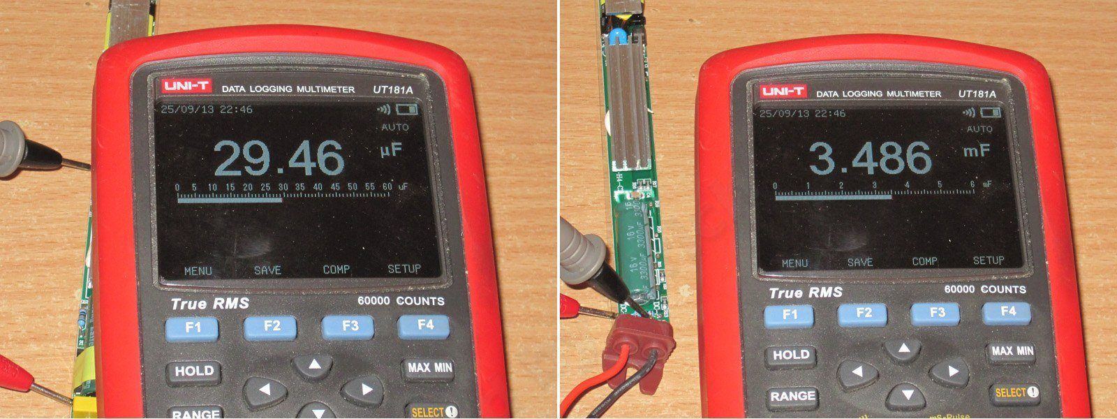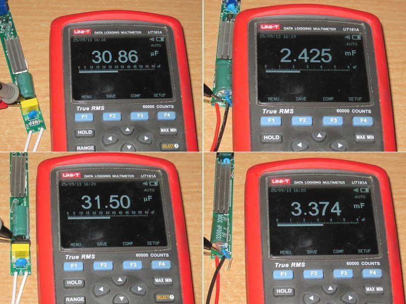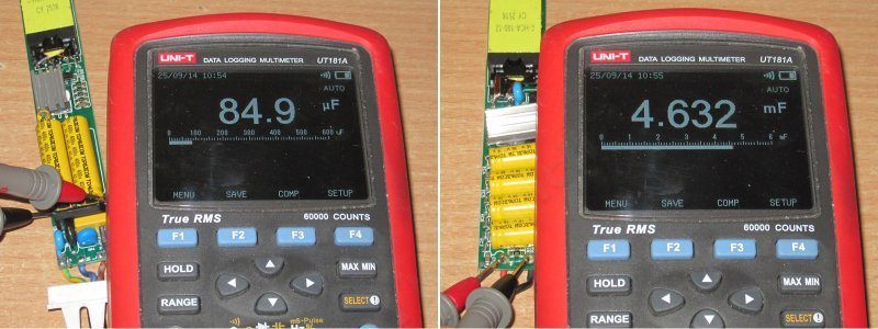 Измеренная емкость конденсаторов по входу и выходу соответственно первого и второго блока питания. По входу несколько маловато, для 230 вольт пойдет, а вот при 115 ШИМ контроллеру придется тяжеловато.