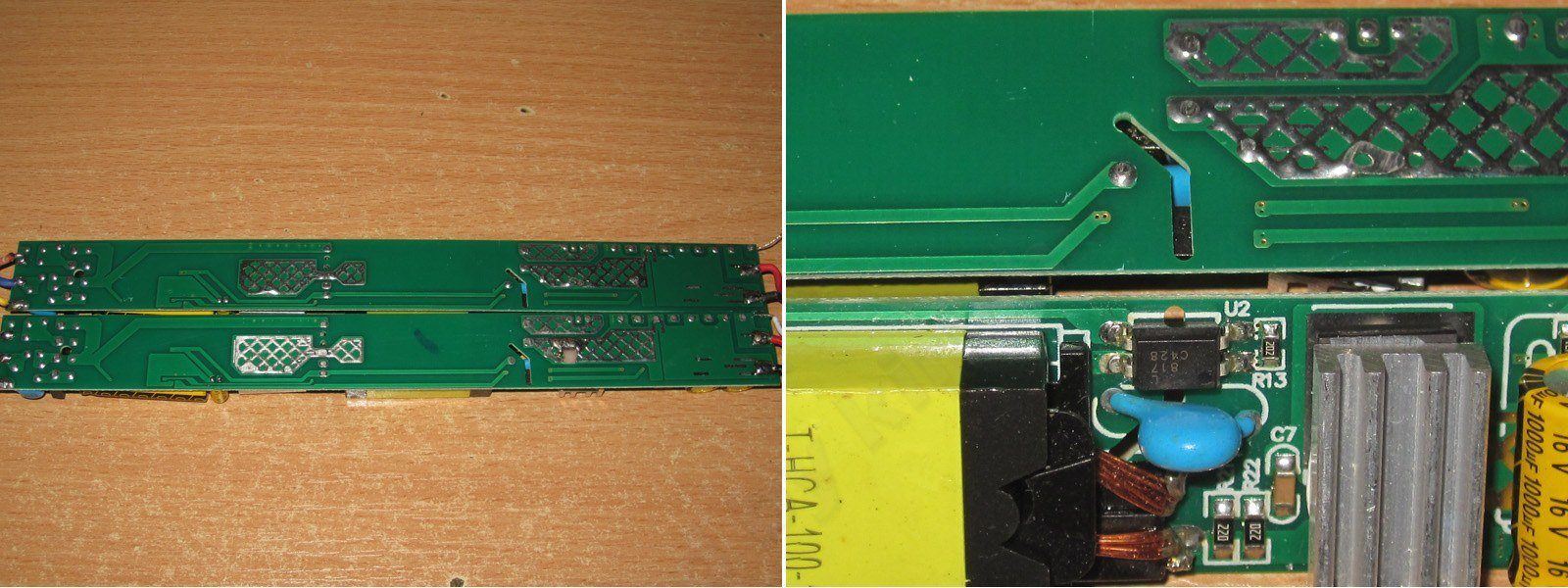 Но это в принципе не проблема, потому как данные контроллеры имеют внутри термозащиту и в худшем случае должны просто отключиться. А вот реальная проблема в том, что оптрон обратной связи вынесен на горячую сторону, причем далеко и соответственно дорожки "холодной" стороны проходят в непосредственной близости около дорожек "горячей".